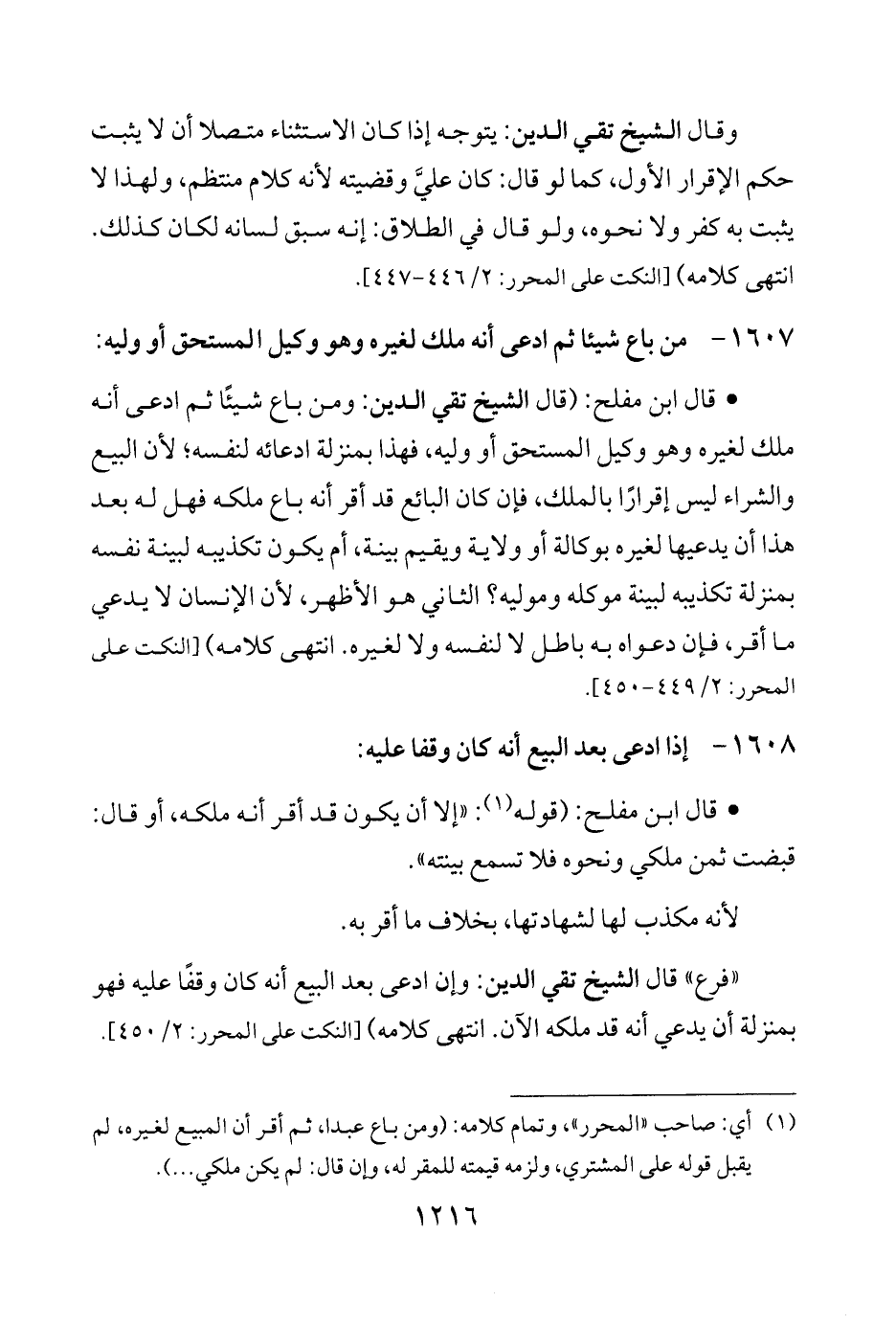 • قال ابن مفلح: (قال الشيخ تقي الدين: ومن باع شيئًا ثم ادعى أنَّه ملك لغيره وهو وكيل المستحق أو وليه، فهذا بمنزلة ادعائه لنفسه، لأن البيع والشراء ليس إقرارًا بالملك، فإن كان البائع قد أقر أنَّه باع ملكه فهل له بعد هذا أن يدعيها لغيره بوكالة أو ولاية ويقيم بينة، أم يكون تكذيبه لبينة نفسه بمنزلة تكذيبه لبينة موكله وموليه؟ الثاني هو الأظهر، لأن الإنسان لا يدعي ما أقر، فإن دعواه به باطل لا لنفسه ولا لغيره. انتهى كلامه) [النكت على المحرر: 2/ 449 - 450].