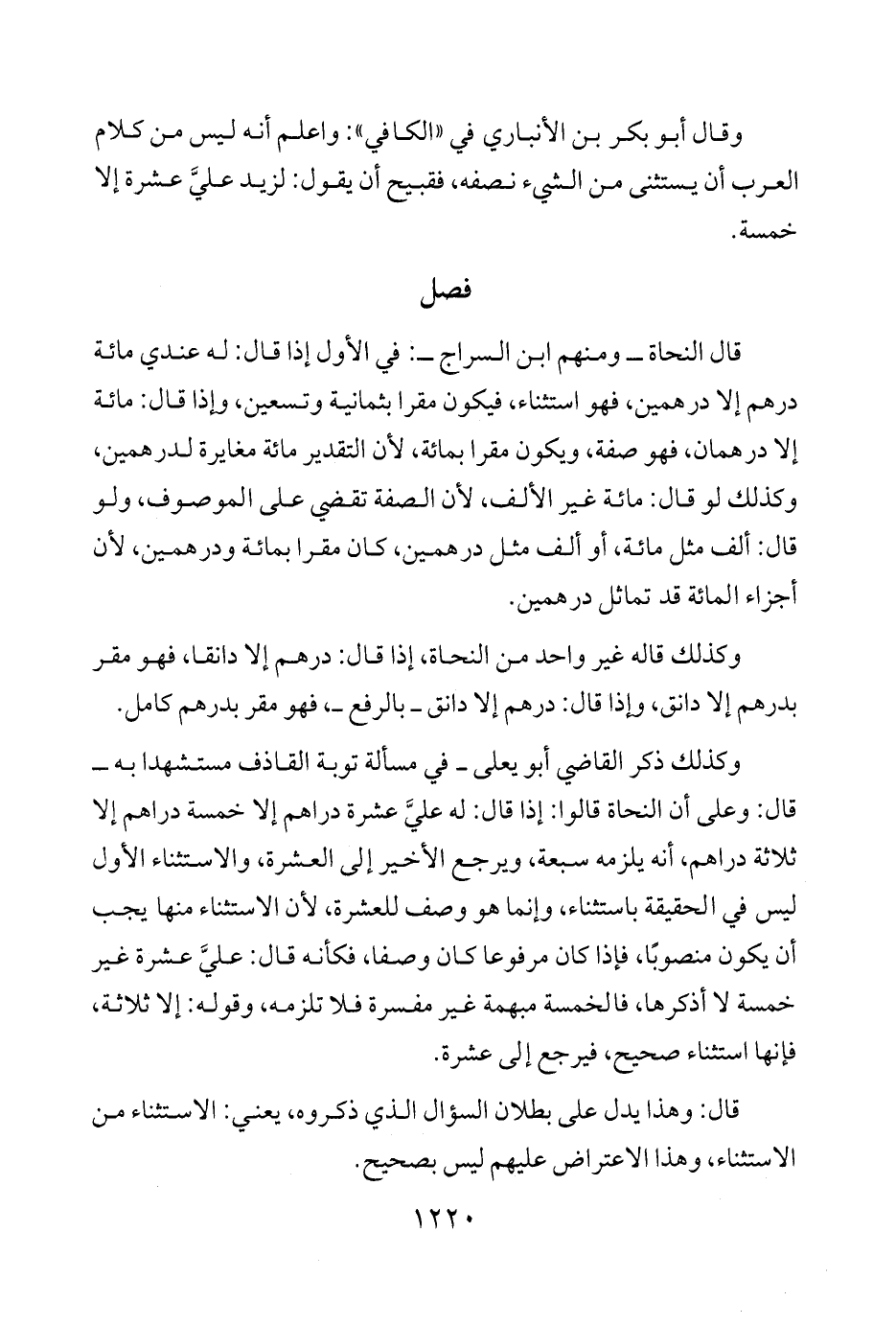 وكذلك ذكر القاضي أَبو يعلى -في مسألة توبة القاذف مستشهدا به- قال: وعلى أن النحاة قالوا: إذا قال: له عليَّ عشرة دراهم إلَّا خمسة دراهم إلَّا ثلاثة دراهم، أنَّه يلزمه سبعة، ويرجع الأخير إلى العشرة، والاستثناء الأواط ليس في الحقيقة باستثناء، وإنَّما هو وصف للعشرة، لأن الاستثناء منها يجب أن يكون منصوبًا، فإذا كان مرفوعًا كان وصفا، فكأنه قال: عليَّ عشرة غير خمسة لا أذكرها، فالخمسة مبهمة غير مفسرة فلا تلزمه، وقوله: إلَّا ثلاثة، فإنها استثناء صحيح، فيرجع إلى عشرة.