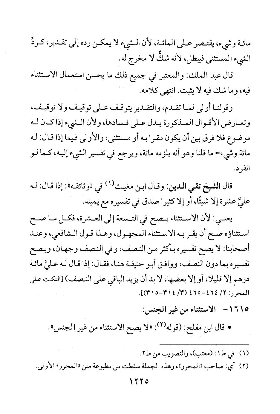 • قال ابن مفلح: (قوله (¬2): "لا يصح الاستثناء من غير الجنس".