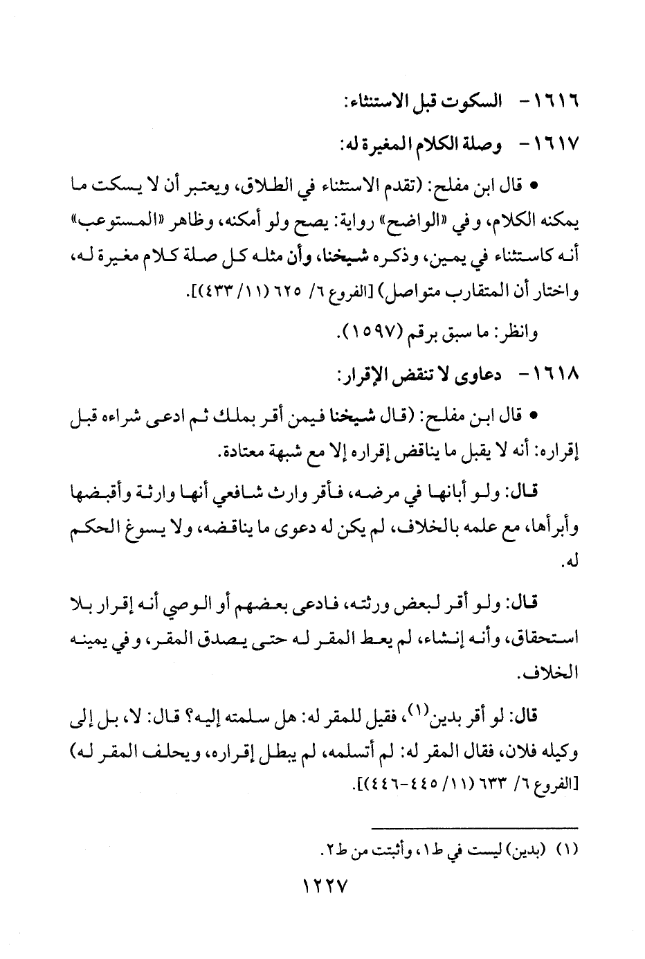 • قال ابن مفلح: (تقدم الاستثناء في الطلاق، ويعتبر أن لا يسكت ما يمكنه الكلام، وفي "الواضح" رواية: يصح ولو أمكنه، وظاهر "المستوعب" أنَّه كاستثناء في يمين، وذكره شيخنا، وأن مثله كل صلة كلام مغيرة له، واختار أن المتقارب متواصل) [الفروع 6/ 625 (11/ 433)].