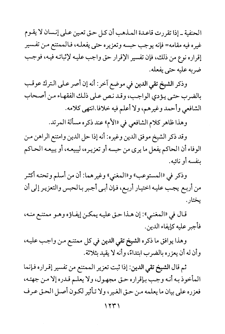 وذكر الشيخ تقي الدين في موضع آخر: أنَّه إن أصر على الترك عوقب بالضرب حتَّى يؤدي الواجب، وقد نص على ذلك الفقهاء من أصحاب الشَّافعي وأحمد وغيرهم، ولا أعلم فيه خلافا. انتهى كلامه.