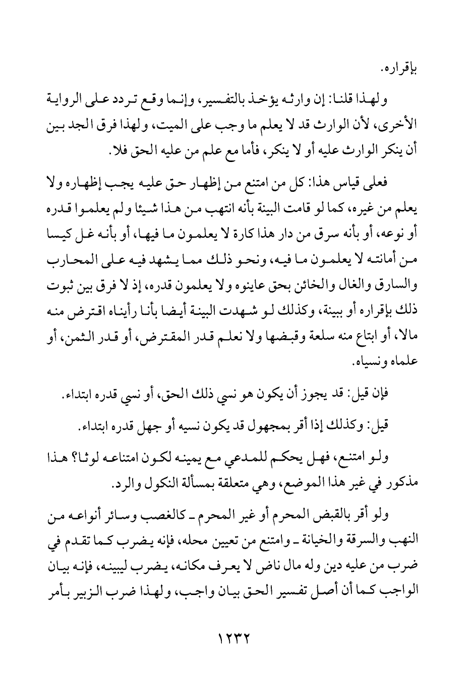 فعلى قياس هذا: كل من امتنع من إظهار حق عليه يجب إظهاره ولا يعلم من غيره، كما لو قامت البينة بأنه انتهب من هذا شيئًا ولم يعلموا قدره أو نوعه، أو بأنه سرق من دار هذا كارة لا يعلمون ما فيها، أو بأنه غل كيسا من أمانته لا يعلمون ما فيه، ونحو ذلك مما يشهد فيه على المحارب والسارق والغال والخائن بحق عاينوه ولا يعلمون قدره، إذ لا فرق بين ثبوت ذلك بإقراره أو ببينة، وكذلك لو شهدت البينة أيضًا بأنا رأيناه اقترض منه مالا، أو ابتاع منه سلعة وقبضها ولا نعلم قدر المقترض، أو قدر الثمن، أو علماه ونسياه.