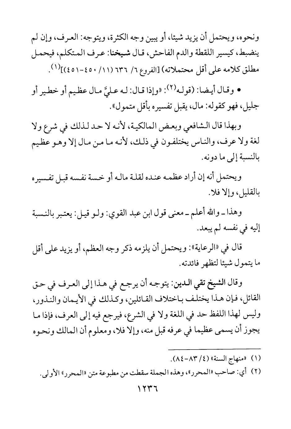 ونحوه، ويحتمل أن يزيد شيئًا، أو يبين وجه الكثرة، ويتوجه: العرف، وإن لم ينضبط، كيسير اللقطة والدم الفاحش، قال شيخنا: عرف المتكلم، فيحمل مطلق كلامه على أقل محتملاته) [الفروع 6/ 636 (11/ 450 - 451)] (¬1).