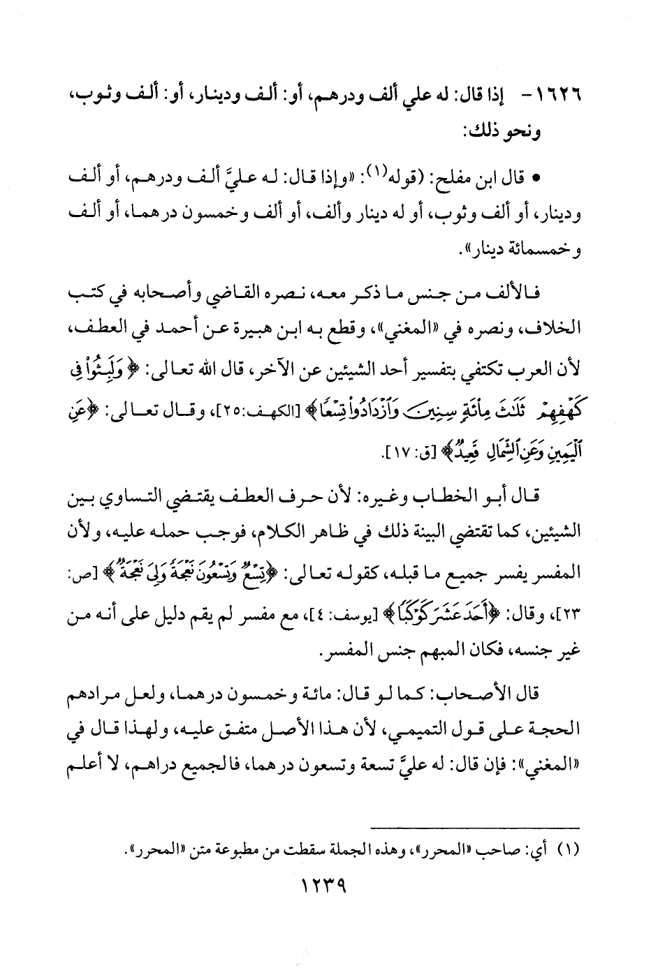 1626 - إذا قال: له علي ألف ودرهم، أو: ألف ودينار، أو: ألف وثوب، ونحو ذلك: