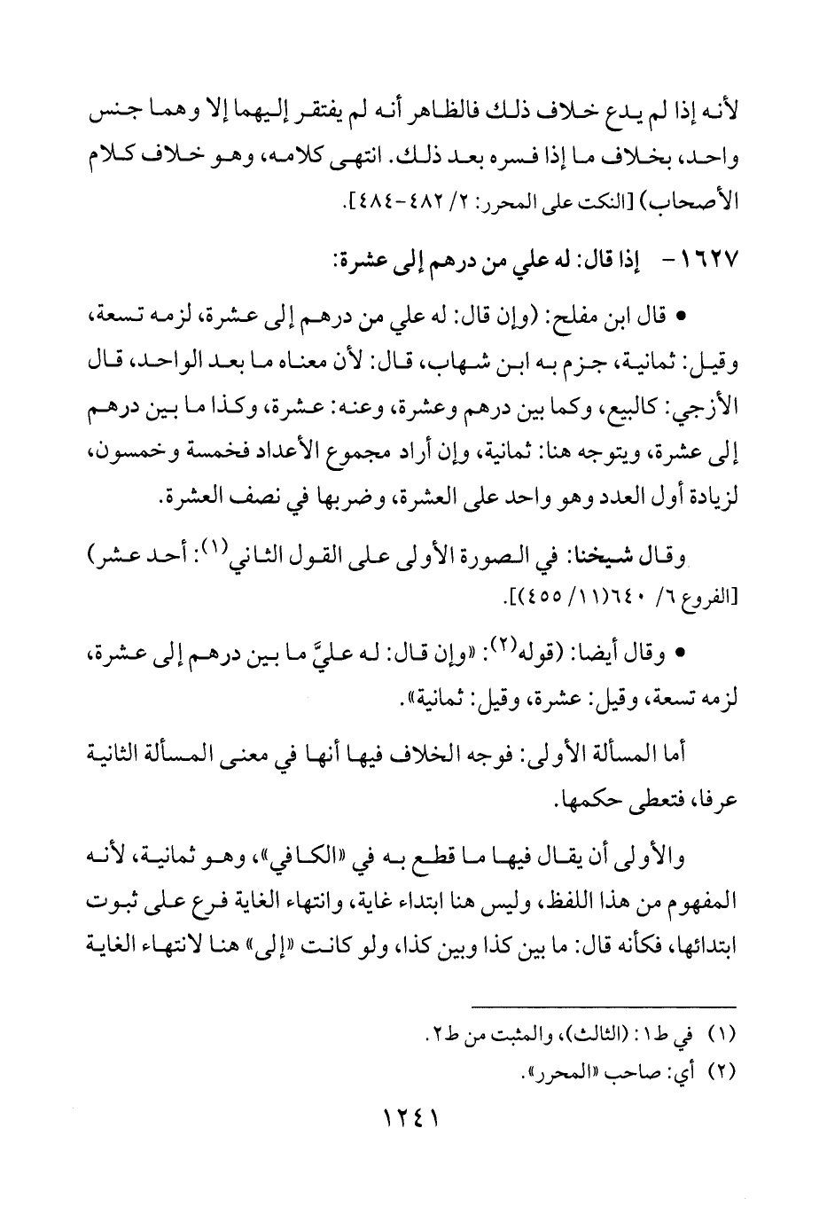 • قال ابن مفلح: (وإن قال: له علي من درهم إلى عشرة، لزمه تسعة، وقيل: ثمانية، جزم به ابن شهاب، قال: لأن معناه ما بعد الواحد، قال الأزجي: كالبيع، وكما بين درهم وعشرة، وعنه: عشرة، وكذا ما بين درهم إلى عشرة، ويتوجه هنا: ثمانية، وإن أراد مجموع الأعداد فخمسة وخمسون، لزيادة أول العدد وهو واحد على العشرة، وضربها في نصف العشرة.