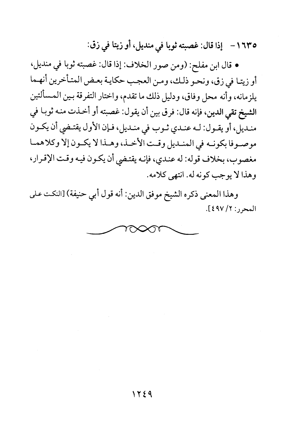 • قال ابن مفلح: (ومن صور الخلاف: إذا قال: غصبته ثوبا في منديل، أو زيتا في زق، ونحو ذلك، ومن العجب حكاية بعض المتأخرين أنهما يلزمانه، وأنه محل وفاق، ودليل ذلك ما تقدم، واختار التفرقة بين المسألتين الشيخ تقي الدين، فإنه قال: فرق بين أن يقول: غصبته أو أخذت منه ثوبا في منديل، أو يقول: له عندي ثوب في منديل، فإن الأول يقتضي أن يكون موصوفا بكونه في المنديل وقت الأخذ، وهذا لا يكون إلَّا وكلاهما مغصوب، بخلاف قوله: له عندي، فإنه يقتضي أن يكون فيه وقت الإقرار، وهذا لا يوجب كونه له. انتهى كلامه.