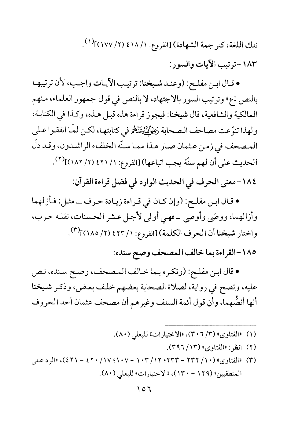 • قال ابن مفلح: (وعند شيخنا: ترتيب الآيات واجب، لأن ترتيبها بالنص "ع" وترتيب السور بالاجتهاد، لا بالنص في قول جمهور العلماء، منهم المالكيه والشافعية، قال شيخنا: فيجوز قراءة هذه قبل هذه، وكذا في الكتابة، ولهذا تنوّعت مصاحف الصحابة - رضي الله عنهم - في كتابتها، لكن لمّا اتفقوا على المصحف في زمن عثمان صار هذا مما سنّه الخلفاء الراشدون، وقد دلّ الحديث على أن لهم سنّة يجب اتباعها) [الفروع: 1/ 421 (2/ 182)] (¬2).