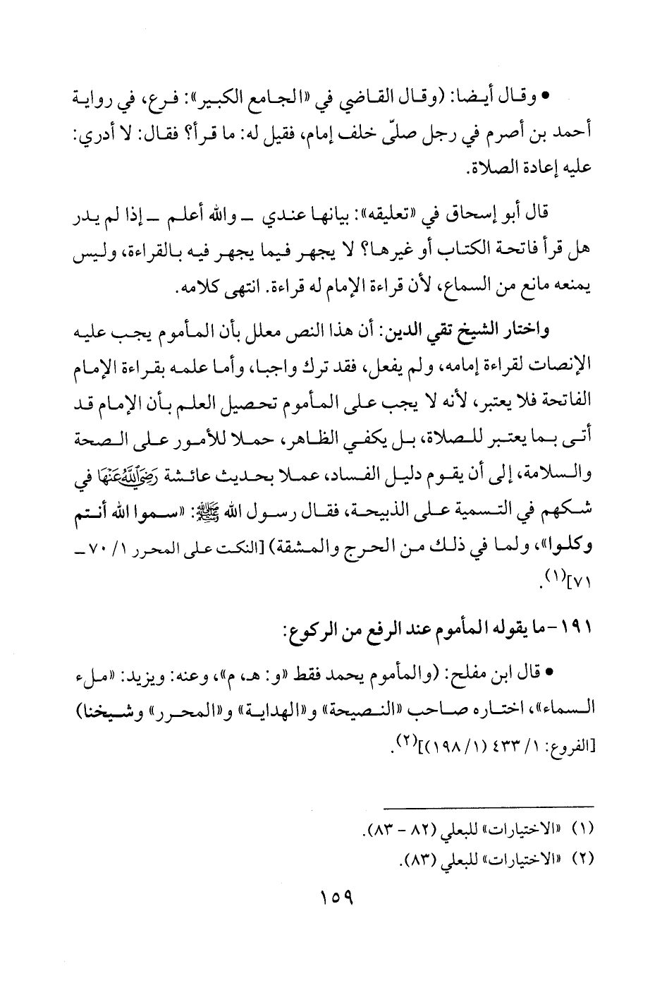 • قال ابن مفلح: (والمأموم يحمد فقط "و: هـ، م"، وعنه: ويزيد: "ملء السماء"، اختاره صاحب "النصيحة" و"الهداية" و"المحرر" وشيخنا) [الفروع: 1/ 433 (1/ 198)] (¬2).