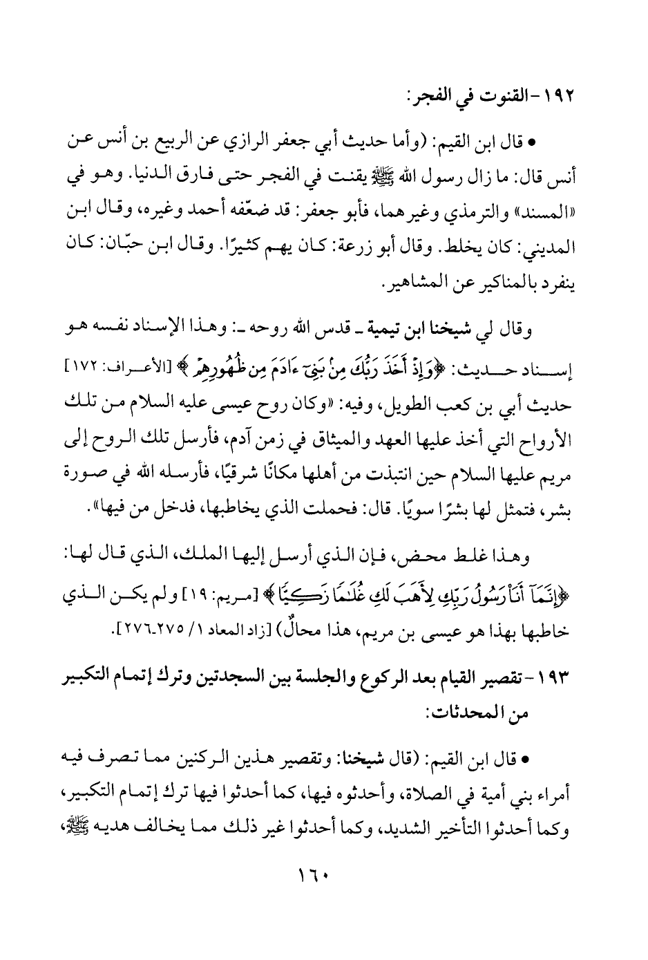 • قال ابن القيم: (وأما حديث أبي جعفر الرازي عن الربيع بن أنس عن أنس قال: ما زال رسول الله - صلى الله عليه وسلم - يقنت في الفجر حتى فارق الدنيا. وهو في "المسند" والترمذي وغيرهما، فأبو جعفر: قد ضعّفه أحمد وغيره، وقال ابن المديني: كان يخلط. وقال أبو زرعة: كان يهم كثيرًا. وقال ابن حبّان: كان ينفرد بالمناكير عن المشاهير.