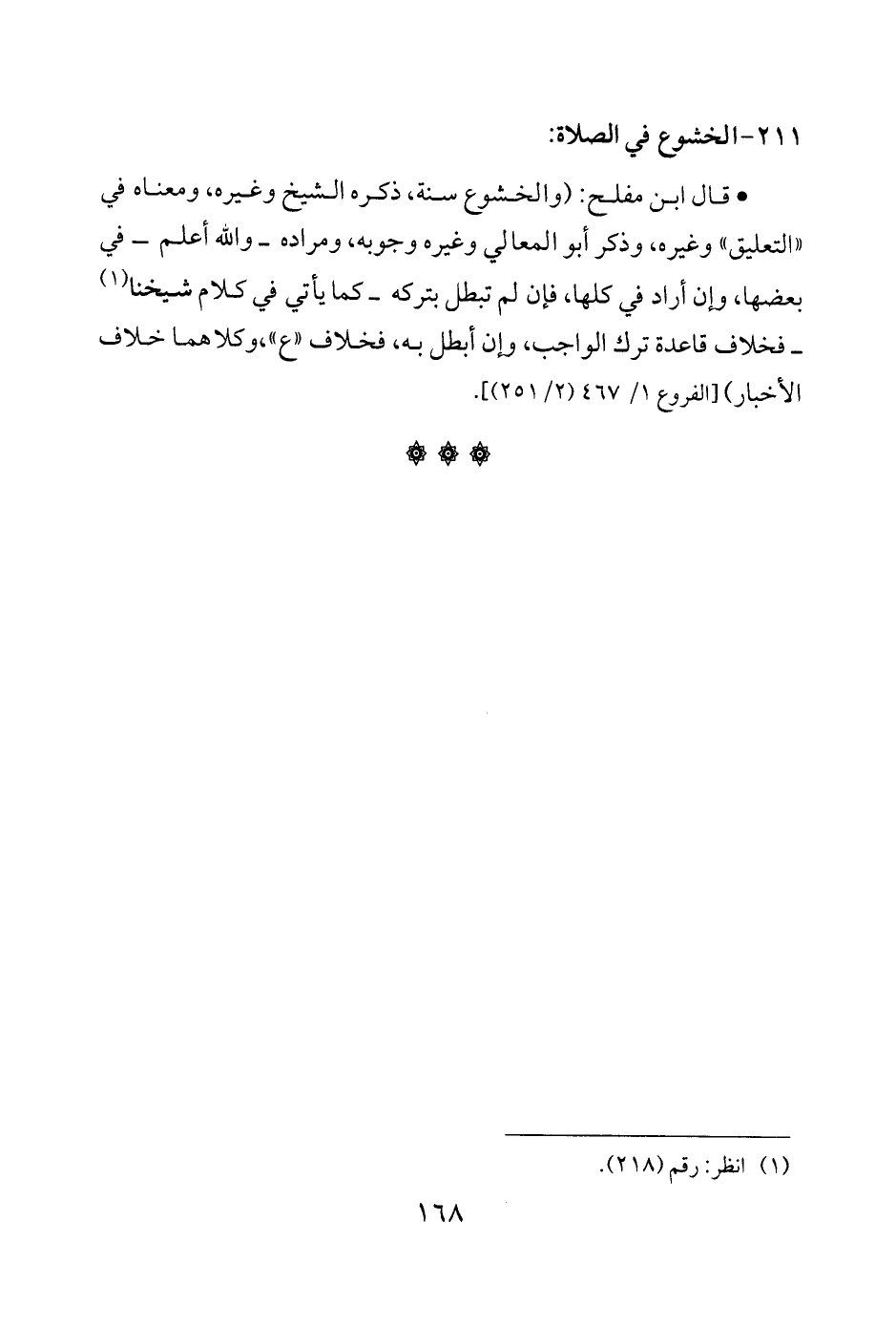 • قال ابن مفلح: (والخشوع سنة، ذكره الشيخ وغيره، ومعناه في "التعليق" وغيره، وذكر أبو المعالي وغيره وجوبه، ومراده -والله أعلم- في بعضها، وإن أراد في كلها، فإن لم تبطل بتركه -كما يأتي في كلام شيخنا (¬1) - فخلاف قاعدة ترك الواجب، وإن أبطل به، فخلاف "ع"، وكلاهما خلاف الأخبار) [الفروع 1/ 467 (2/ 251)].