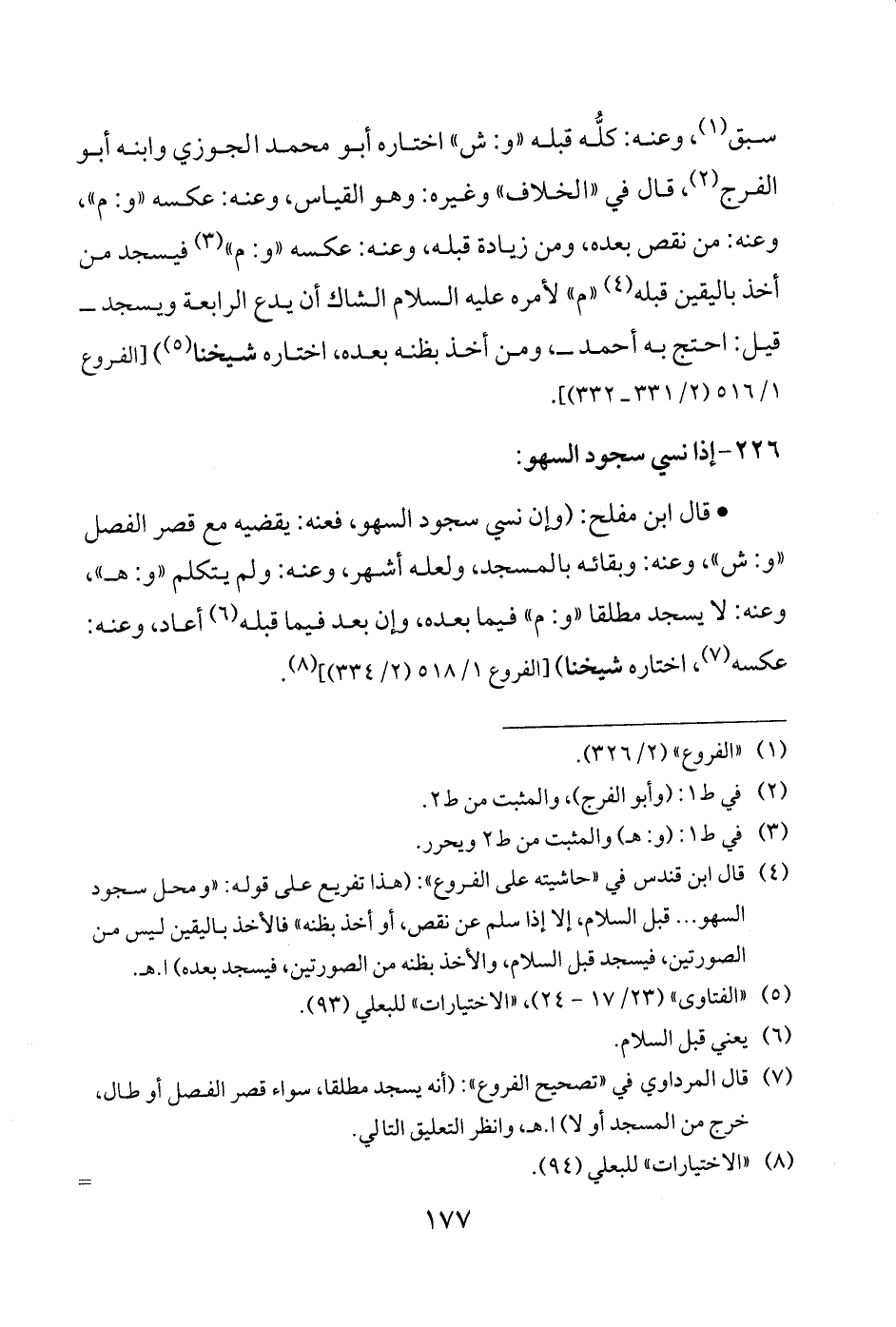 (¬4) قال ابن قندس في "حاشيته على الفروع": (هذا تفريع على قوله: "ومحل سجود السهو ... قبل السلام، إلا إذا سلم عن نقص، أو أخذ بظنه" فالأخذ باليقين ليس من الصورتين، فيسجد قبل السلام، والأخذ بظنه من الصورتين، فيسجد بعده) ا. هـ.