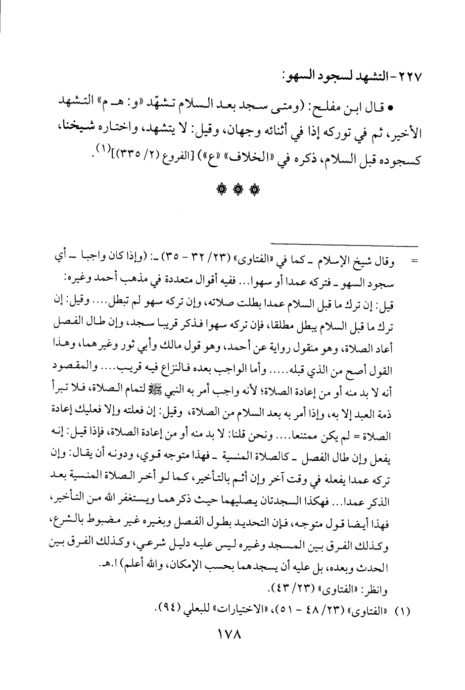 • قال ابن مفلح: (ومتى سجد بعد السلام تشهد "و: هـ م" التشهد الأخير، ثم في توركه إذا في أثنائه وجهان، وقيل: لا يتشهد، واختاره شيخنا، كسجوده قبل السلام، ذكره في "الخلاف" "ع") [الفروع (2/ 335)] (¬1).