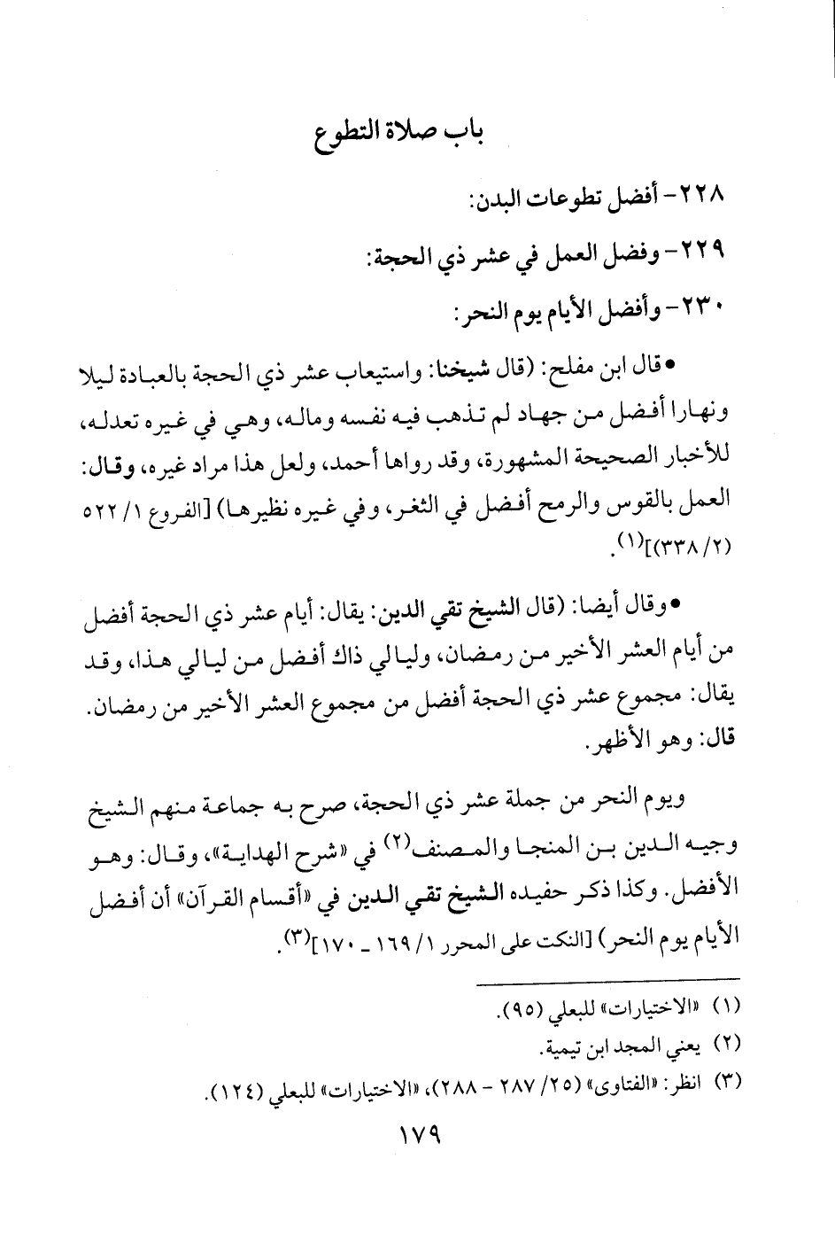 • وقال أيضًا: (قال الشيخ تقي الدين: يقال: أيام عشر ذي الحجة أفضل من أيام العشر الأخير من رمضان، وليالي ذاك أفضل من ليالي هذا، وقد يقال: مجموع عشر ذي الحجة أفضل من مجموع العشر الأخير من رمضان. قال: وهو الأظهر.