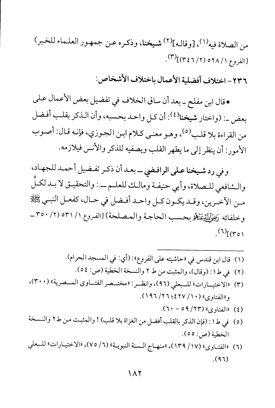 وفي رد شيخنا على الرافضي -بعد أن ذكر تفضيل أحمد للجهاد، والشافعي للصلاة، وأبي حنيفة ومالك للعلم-: والتحقيق لا بد لكلٍّ من الآخرين، وقد يكون كل واحد أفضل في حال، كفعل النبي - صلى الله عليه وسلم - وخلفائه - رضي الله عنهم - بحسب الحاجة والمصلحة) [الفروع 1/ 531 (2/ 350 - 351)] (¬6).