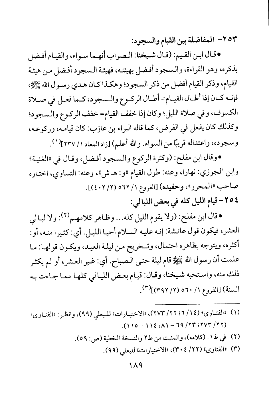 • وقال ابن مفلح: (وكثرة الركوع والسجود أفضل، وقال في "الغنية" وابن الجوزي: نهارا، وعنه: طول القيام "و: هـ ش"، وعنه: التساوي، اختاره صاحب "المحرر"، وحفيده) [الفروع 1/ 562 (2/ 402)].