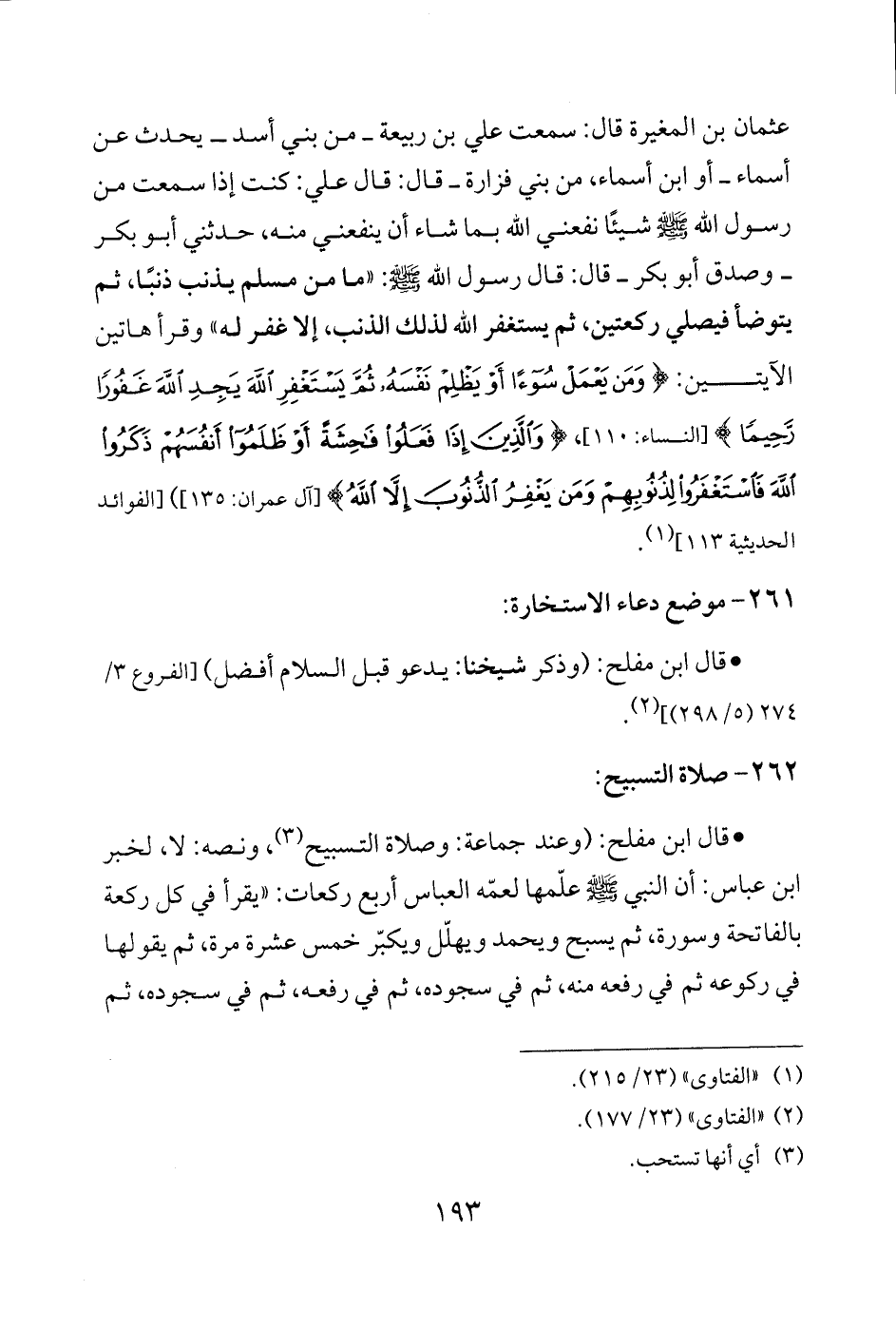 • قال ابن مفلح: (وعند جماعة: وصلاة التسبيح (¬3)، ونصه: لا، لخبر ابن عباس: أن النبي - صلى الله عليه وسلم - علّمها لعمّه العباس أربع ركعات: "يقرأ في كل ركعة بالفاتحة وسورة، ثم يسبح ويحمد ويهلّل ويكبّر خمس عشرة مرة، ثم يقولها في ركوعه ثم في رفعه منه، ثم في سجوده، ثم في رفعه، ثم في سجوده، ثم