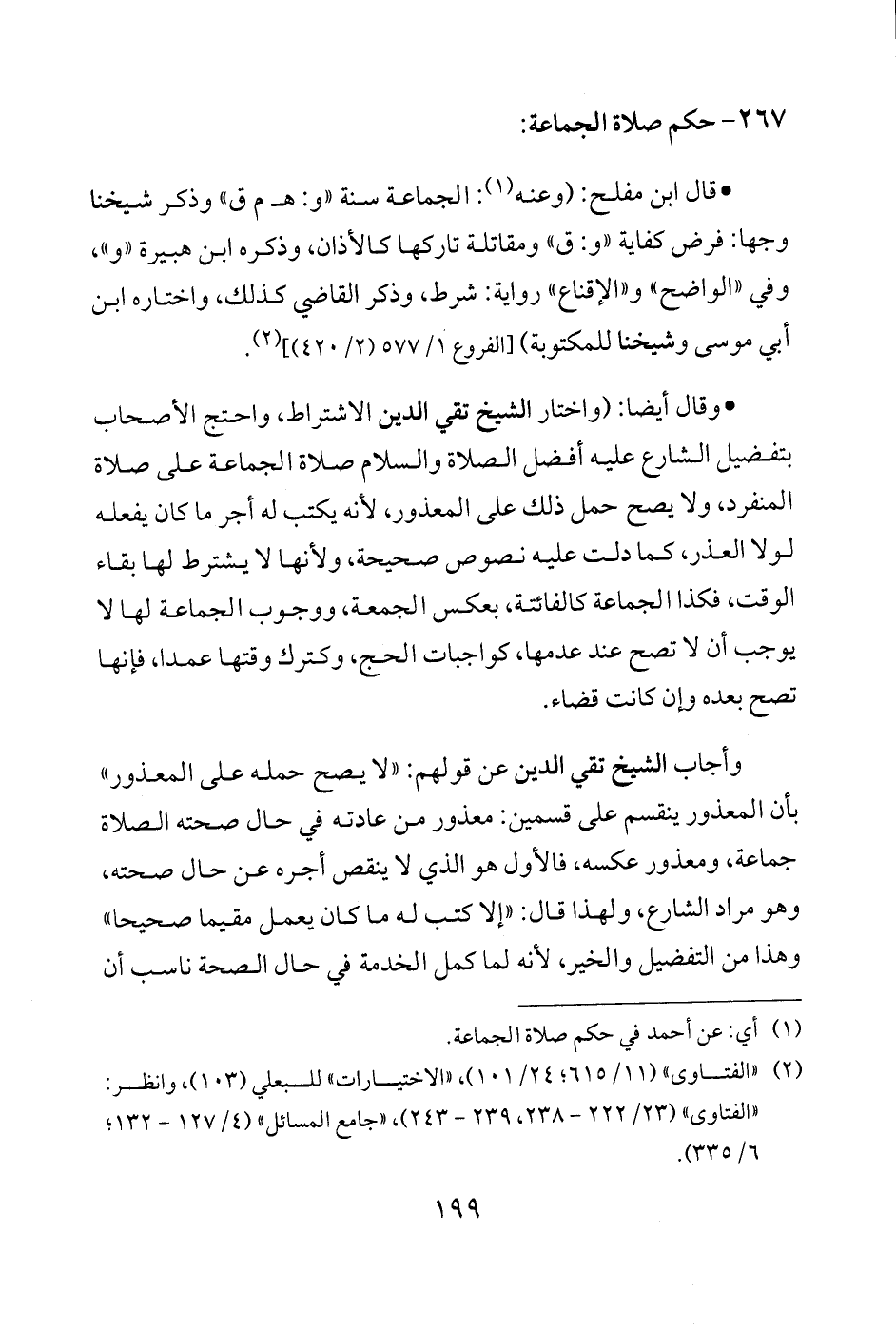 • وقال أيضًا: (واختار الشيخ تقي الدين الاشتراط، واحتج الأصحاب بتفضيل الشارع عليه أفضل الصلاة والسلام صلاة الجماعة على صلاة المنفرد، ولا يصح حمل ذلك على المعذور، لأنه يكتب له أجر ما كان يفعله لولا العذر، كما دلت عليه نصوص صحيحة، ولأنها لا يشترط لها بقاء الوقت، فكذا الجماعة كالفائتة، بعكس الجمعة، ووجوب الجماعة لها لا يوجب أن لا تصح عند عدمها، كواجبات الحج، وكترك وقتها عمدا، فإنها تصح بعده وإن كانت قضاء.
