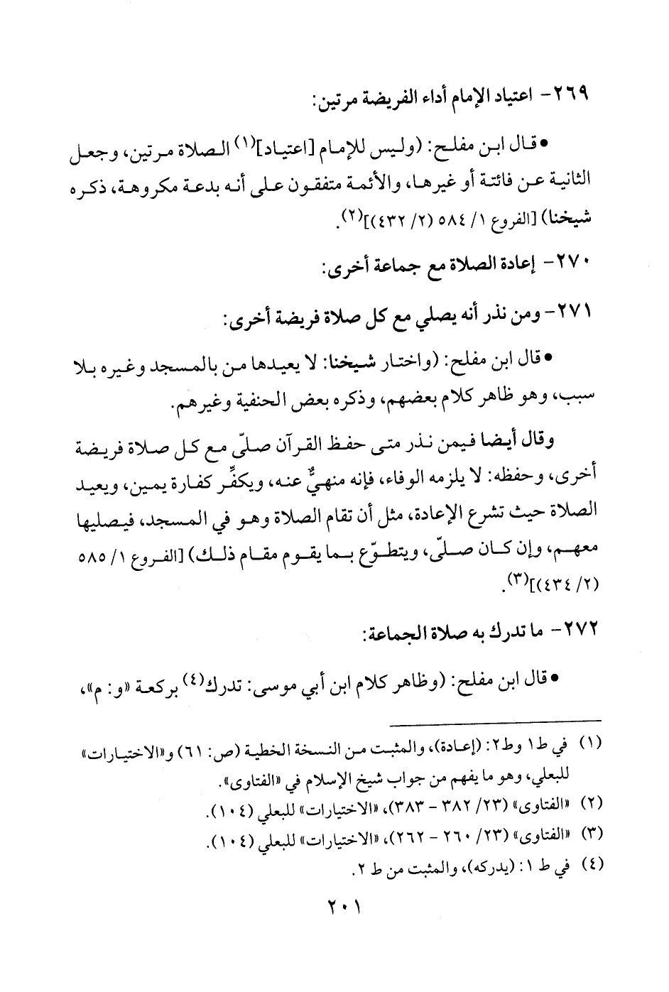 • قال ابن مفلح: (وليس للإمام [اعتياد] (¬1) الصلاة مرتين، وجعل الثانية عن فائتة أو غيرها، والأئمة متفقون على أنه بدعة مكروهة، ذكره شيخنا) [الفروع 1/ 584 (2/ 432)] (¬2).