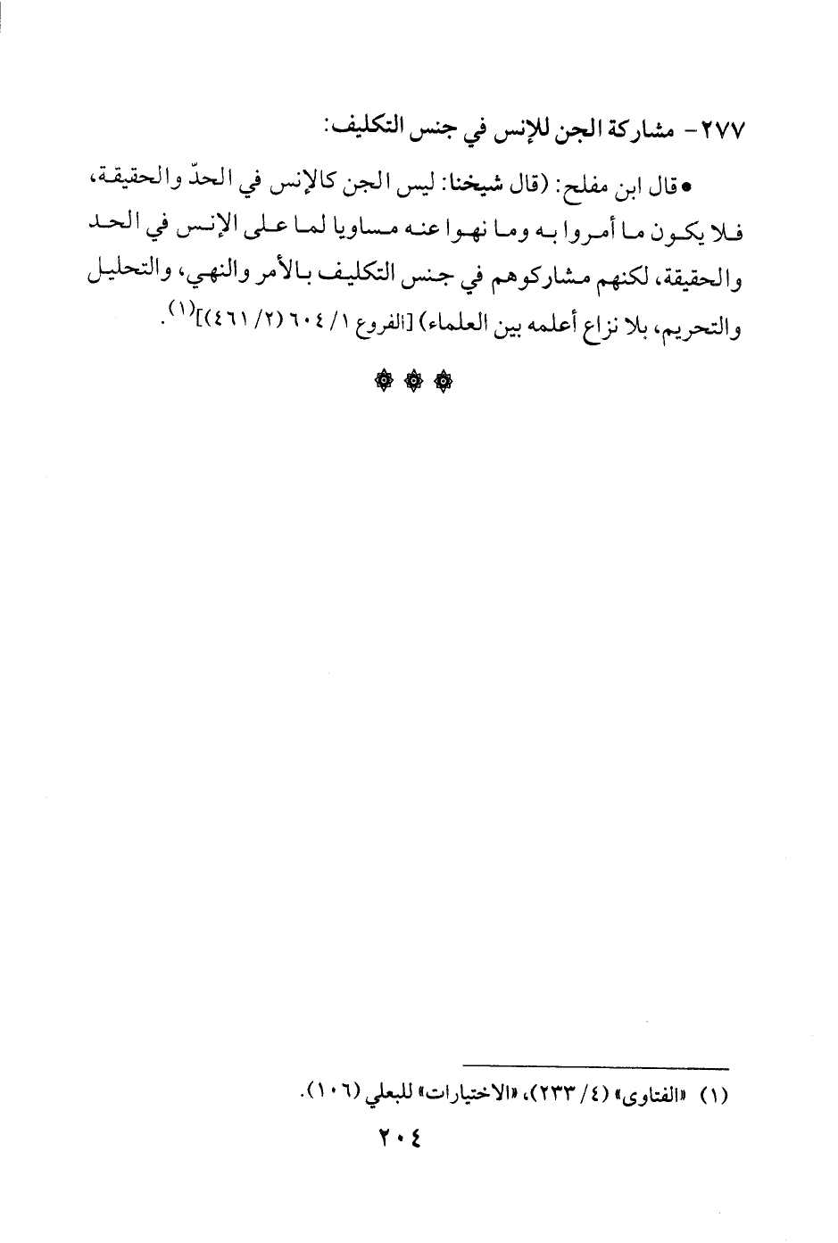 • قال ابن مفلح: (قال شيخنا: ليس الجن كالإنس في الحدّ والحقيقة، فلا يكون ما أمروا به وما نهوا عنه مساويًا لما على الإنس في الحد والحقيقة، لكنهم مشاركوهم في جنس التكليف بالأمر والنهي، والتحليل والتحريم، بلا نزاع أعلمه بين العلماء) [الفروع 1/ 604 (2/ 461)] (¬1).