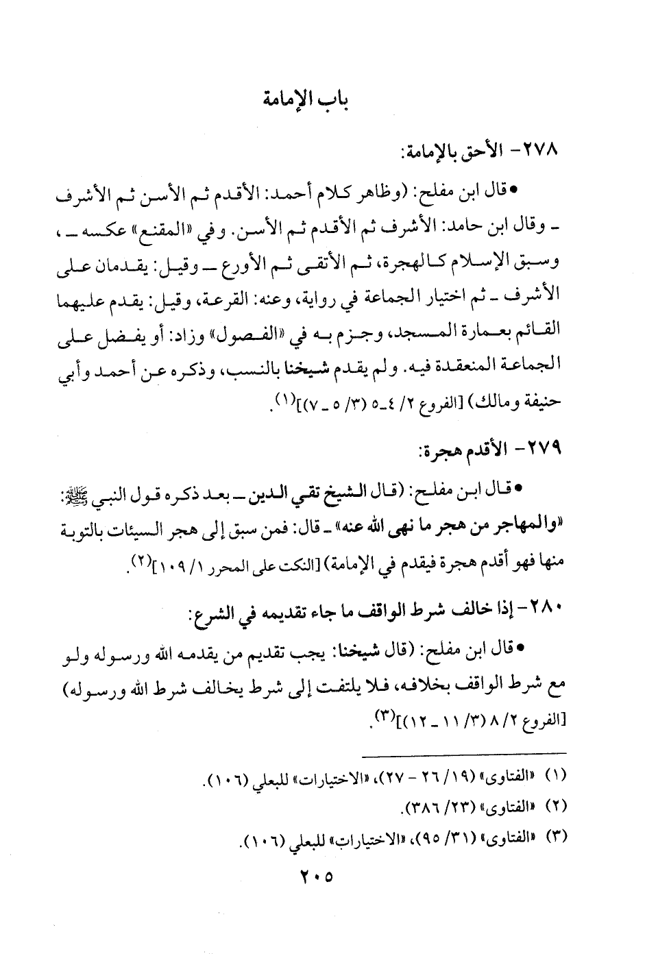 • قال ابن مفلح: (قال الشَّيخ تقي الدين -بعد ذكره قول النَّبيِّ - صلى الله عليه وسلم -: "والمهاجر من هجر ما نهى الله عنه"- قال: فمن سبق إلى هجر السيئات بالتوبة منها فهو أقدم هجرة فيقدم في الإمامة) [النكت على المحرر 1/ 109] (¬2).