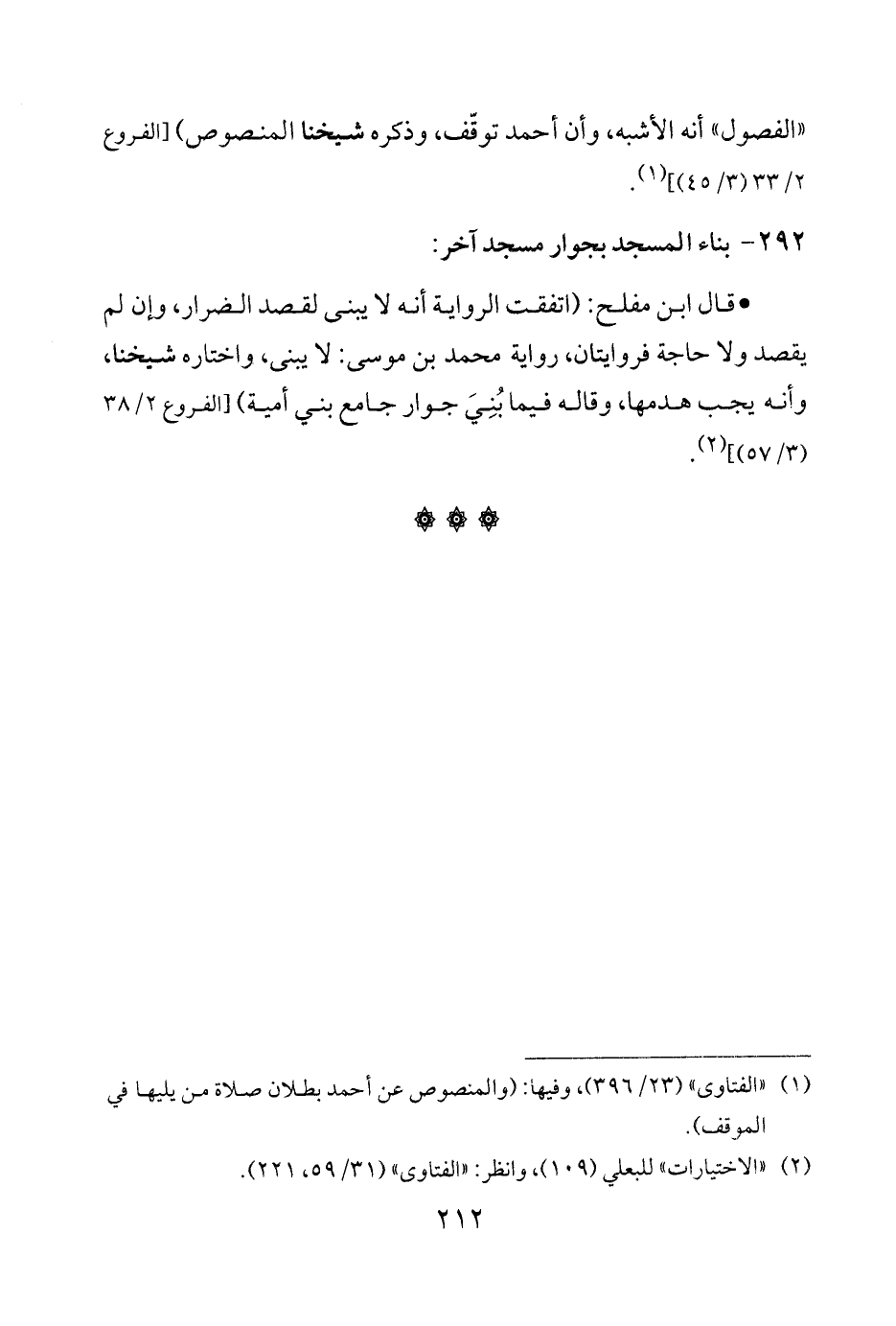 • قال ابن مفلح: (اتفقت الرِّواية أنَّه لا يبنى لقصد الضرار، وإن لم يقصد ولا حاجة فروايتان، رواية محمَّد بن موسى: لا يبنى، واختاره شيخنا، وإنه يجب هدمها، وقاله فيما بُنِيَ جوار جامع بني أميَّة) [الفروع 2/ 38 (3/ 57)] (¬2).
