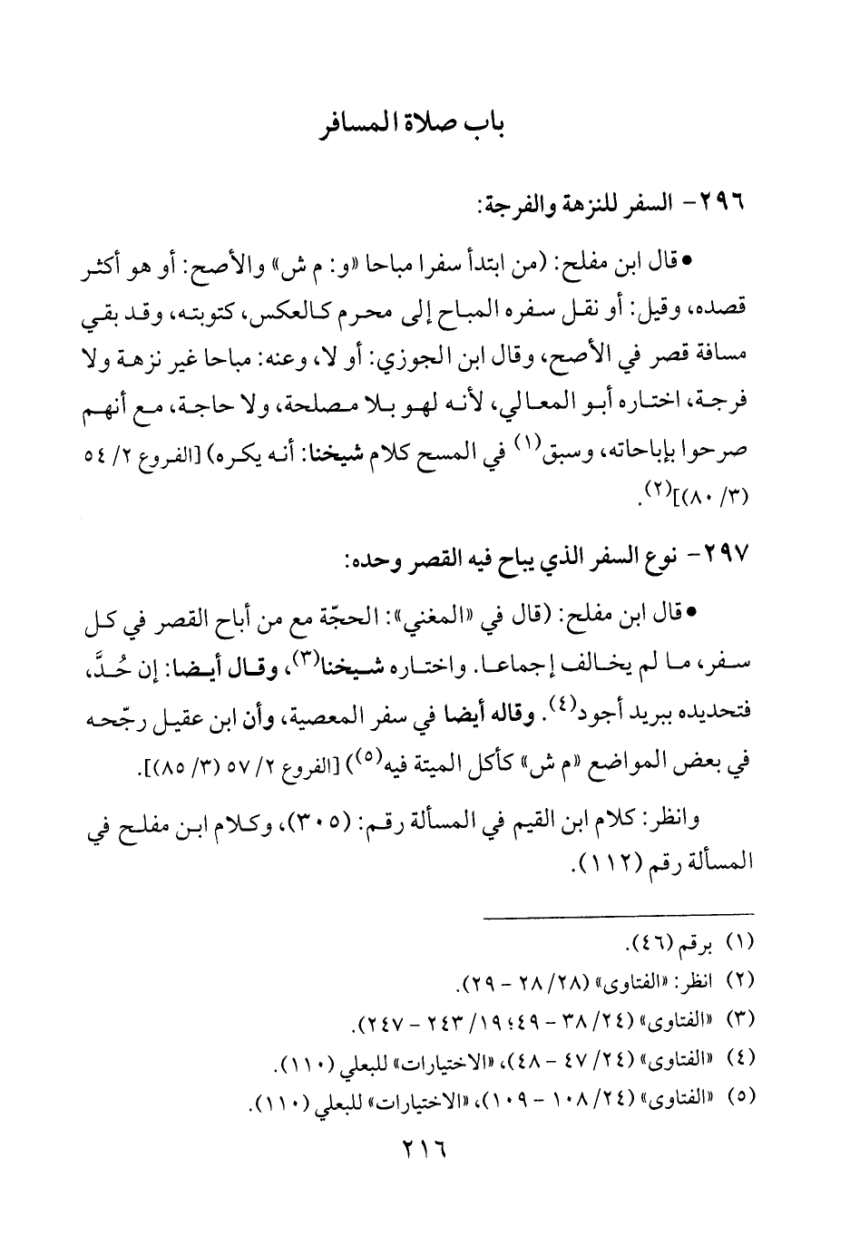 • قال ابن مفلح: (من ابتدأ سفرًا مباحًا "و: م ش" والأصح: أو هو أكثر قصده، وقيل: أو نقل سفره المباح إلى محرم كالعكس، كتوبته، وقد بقي مسافة قصر في الأصح، وقال ابن الجوزي: أو لا، وعنه: مباحًا غير نزهة ولا فرجة، اختاره أبو المعالي؛ لأنَّه لهو بلا مصلحة، ولا حاجة، مع أنهم صرحوا بإباحاته، وسبق (¬1) في المسح كلام شيخنا: أنَّه يكره) [الفروع 2/ 54 (3/ 80)] (¬2).
