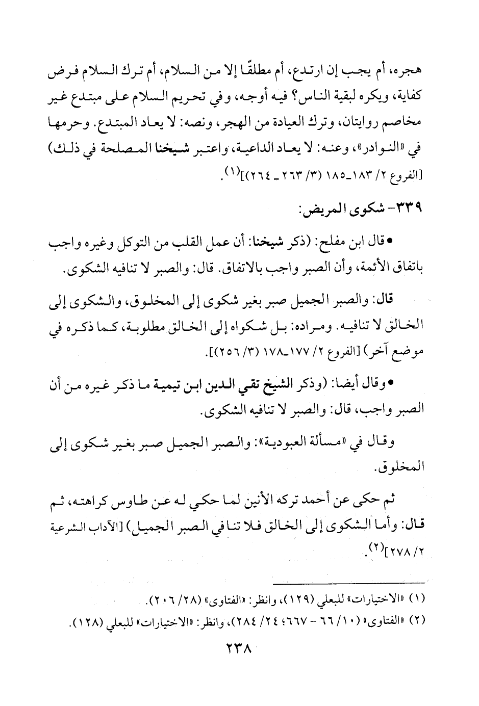 • وقال أيضًا: (وذكر الشَّيخ تقي الدين ابن تيمية ما ذكر غيره من أن الصبر واجب، قال: والصبر لا تنافيه الشكوى.