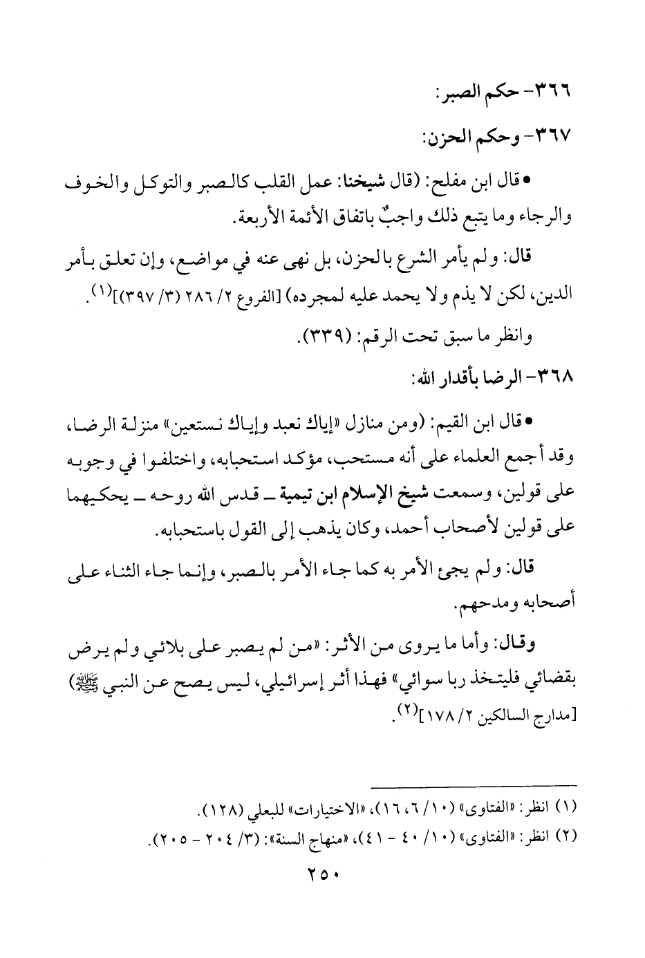 • قال ابن القيِّم: (ومن منازل "إياك نعبد وإياك نستعين" منزلة الرضا، وقد أجمع العلماء على أنَّه مستحب، مؤكد استحبابه، واختلفوا في وجوبه على قولين، وسمعت شيخ الإسلام ابن تيمية -قدس الله روحه- يحكيهما على قولين لأصحاب أحمد، وكان يذهب إلى القول باستحبابه.
