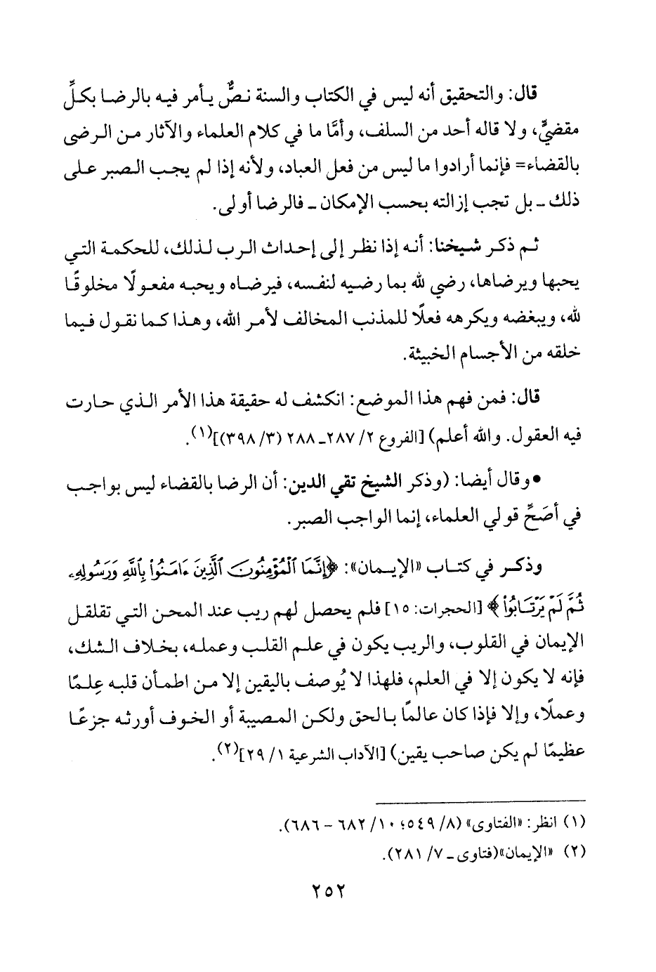وذكر في كتاب "الإيمان": {إِنَّمَا الْمُؤْمِنُونَ الَّذِينَ آمَنُوا بِاللَّهِ وَرَسُولِهِ ثُمَّ لَمْ يَرْتَابُوا} [الحجرات: 15] فلم يحصل لهم ريب عند المحن التي تقلقل الإيمان في القلوب، والريب يكون في علم القلب وعمله، بخلاف الشك، فإنه لا يكون إلا في العلم، فلهذا لا يُوصف باليقين إلا من اطمأن قلبه عِلمًا وعملًا، وإلا فإذا كان عالمًا بالحق ولكن المصيبة أو الخوف أورثه جزعًا عظيمًا لم يكن صاحب يقين) [الآداب الشرعية 1/ 29] (¬2).