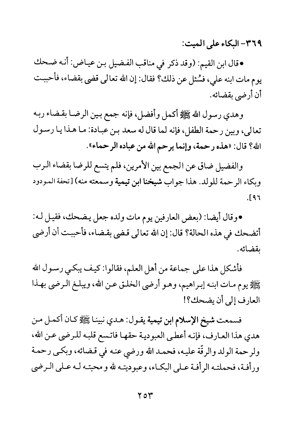 والفضيل ضاق عن الجمع بين الأمرين، فلم يتسع للرضا بقضاء الرب وبكاء الرحمة للولد. هذا جواب شيخنا ابن تيمية وسمعته منه) [تحفة المودود 96].