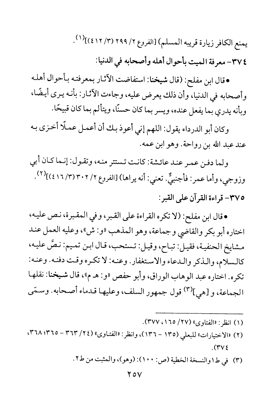 • قال ابن مفلح: "لا تكره القراءة على القبر، وفي المقبرة، نص عليه، اختاره أبو بكر والقاضي وجماعة، وهو المذهب "و: ش"، وعليه العمل عند مشايخ الحنفية، فقيل: تباح، وقيل: تستحب، قال ابن تميم: نصَّ عليه، كالسلام، والذكر والدعاء والاستغفار. وعنه: لا تكره وقت دفنه. وعنه: تكره. اختاره عبد الوهاب الوراق، وأبو حفص "و: هـ م"، قال شيخنا: نقلها الجماعة، و [هي] (¬3) قول جمهور السلف، وعليها قدماء أصحابه. وسمّى