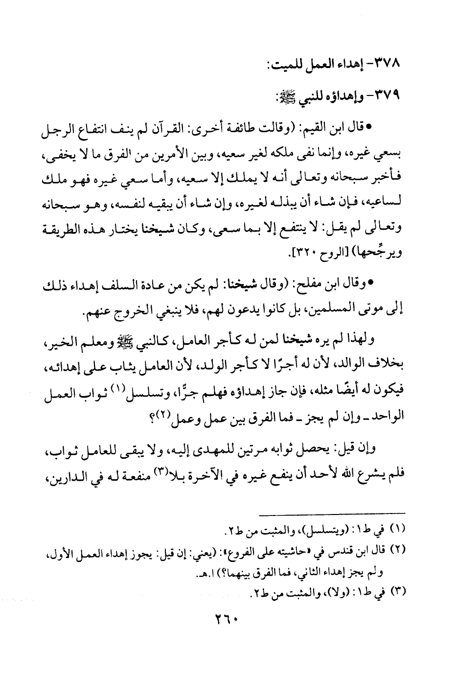 • وقال ابن مفلح: (وقال شيخنا: لم يكن من عادة السلف إهداء ذلك إلى موتى المسلمين، بل كانوا يدعون لهم، فلا ينبغي الخروج عنهم.