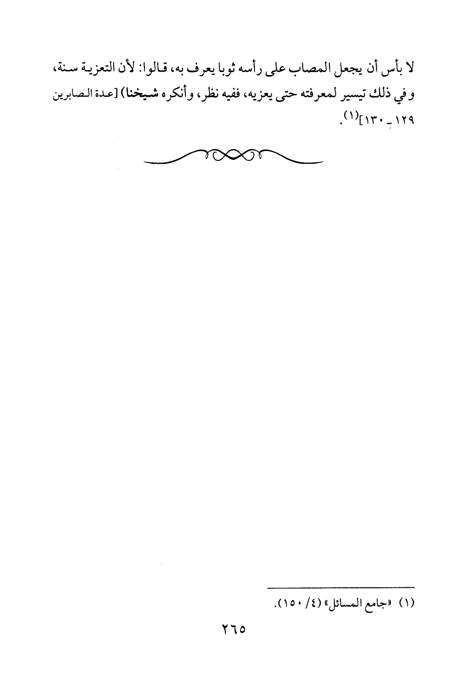 لا بأس أن يجعل المصاب على رأسه ثوبا يعرف به، قالوا: لأن التعزية سنة، وفي ذلك تيسير لمعرفته حتى يعزيه، ففيه نظر، وأنكره شيخنا) [عدة الصابرين 129 - 130] (¬1).