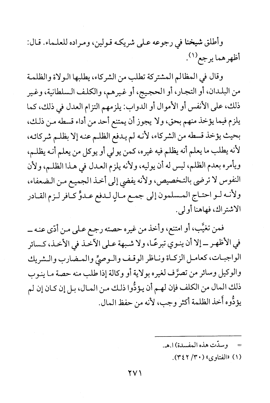 وقال في المظالم المشتركة تطلب من الشركاء، يطلبها الولاة والظلمة من البلدان، أو التجار، أو الحجيج، أو غيرهم، والكلف السلطانية، وغير ذلك، على الأنفس أو الأموال أو الدواب: يلزمهم التزام العدل في ذلك، كما يلزم فيما يؤخذ منهم بحق، ولا يجوز أن يمتنع أحد من أداء قسطه من ذلك، بحيث يؤخذ قسطه من الشركاء، لأنه لم يدفع الظلم عنه إلا بظلم شركائه، لأنه يطلب ما يعلم أنه يظلم فيه غيره، كمن يولي أو يوكل من يعلم أنه يظلم، ويأمره بعدم الظلم، ليس له أن يوليه، ولأنه يلزم العدل في هذا الظلم، ولأن النفوس لا ترضى بالتخصيص، ولأنه يفضي إلى أخذ الجميع من الضعفاء، ولأنه لو احتاج المسلمون إلى جمع مالٍ لدفع عدوٍّ كافر لزم القادر الاشتراك، فهاهنا أولى.