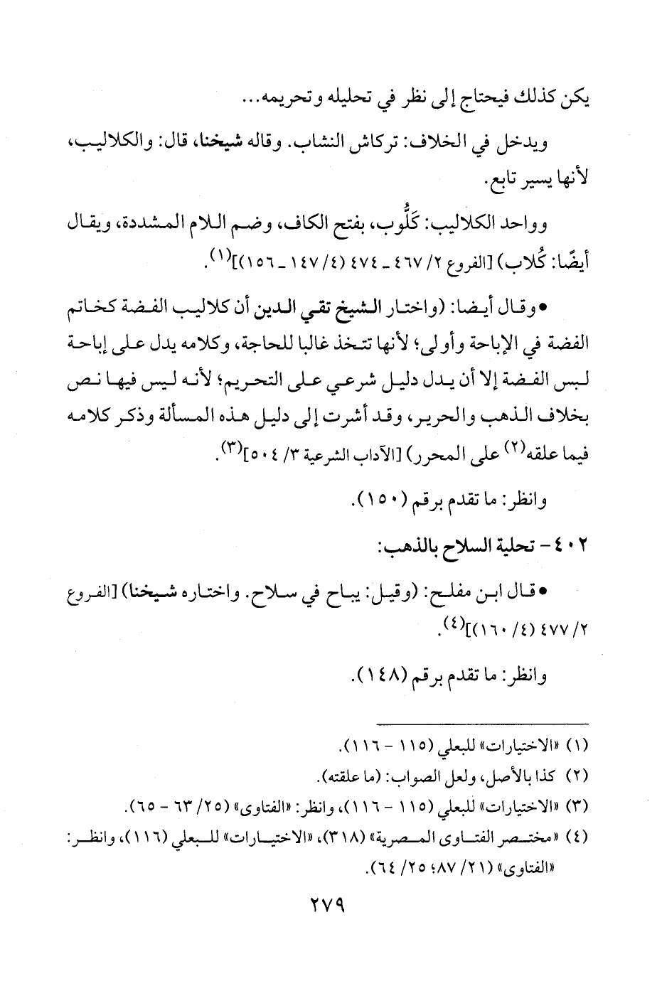 * وقال أيضًا: (واختار الشيخ تقي الدين أن كلاليب الفضة كخاتم الفضة في الإباحة وأولى؛ لأنها تتخذ غالبا للحاجة، وكلامه يدل على إباحة لبس الفضة إلا أن يدل دليل شرعي على التحريم؛ لأنه ليس فيها نص بخلاف الذهب والحرير، وقد أشرت إلى دليل هذه المسألة وذكر كلامه فيما علقه (¬2) على المحرر) [الآداب الشرعية 3/ 504] (¬3).