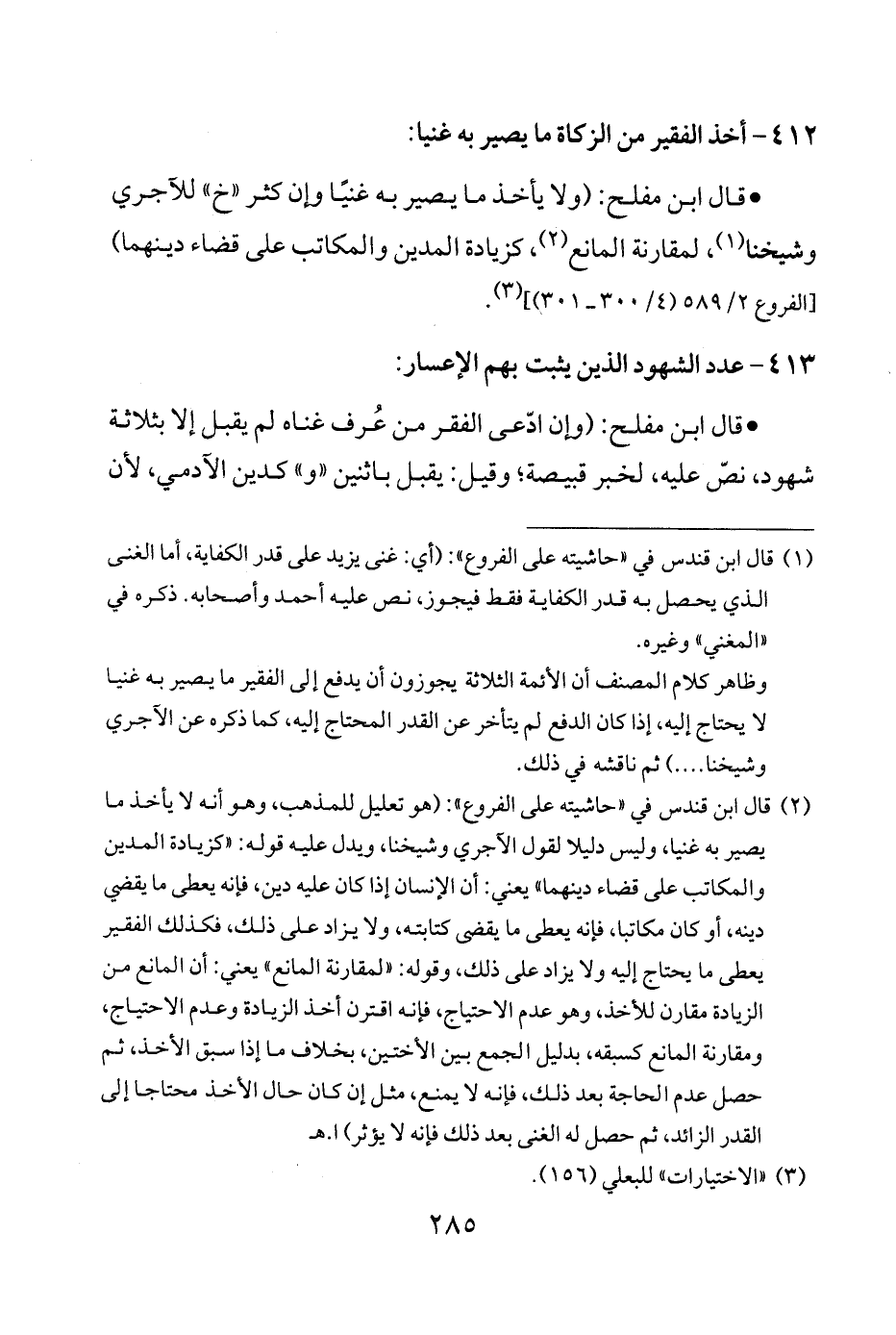(¬2) قال ابن قندس في "حاشيته على الفروع": (هو تعليل للمذهب، وهو أنه لا يأخذ ما يصير به غنيا، وليس دليلا لقول الآجري وشيخنا، ويدل عليه قوله: "كزيادة المدين والمكاتب على قضاء دينهما" يعني: أن الإنسان إذا كان عليه دين، فإنه يعطى ما يقضى دينه، أو كان مكاتبا، فإنه يعطى ما يقضى كتابته، ولا يزاد على ذلك، فكذلك الفقير يعطى ما يحتاج إليه ولا يزاد على ذلك، وقوله: "لمقارنة المانع" يعني: أن المانع من الزيادة مقارن للأخذ، وهو عدم الاحتياج، فإنه اقترن أخذ الزيادة وعدم الاحتياج، ومقارنة المانع كسبقه، بدليل الجمع بين الأختين، بخلاف ما إذا سبق الأخذ، ثم حصل عدم الحاجة بعد ذلك، فإنه لا يمنع، مثل إن كان حال الأخذ محتاجا إلى القدر الزائد، ثم حصل له الغنى بعد ذلك فإنه لا يؤثر) ا. هـ