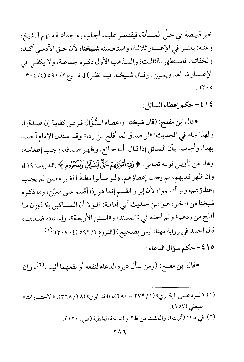 * قال ابن مفلح: (قال شيخنا: وإعطاء السُّؤَّال فرض كفاية إن صدقوا، ولهذا جاء في الحديث: "لو صدق لما أفلح من رده" وقد استدل الإمام أحمد بهذا. وأجاب: بأن السائل إذا قال: أنا جائع، وظهر صدقه، وجب إطعامه، وهذا من تأويل قوله تعالى: {وَفِي أَمْوَالِهِمْ حَقٌّ لِلسَّائِلِ وَالْمَحْرُومِ (19)} [الذاريات: 19]، وإن ظهر كذبهم، لم يجب إعطاؤهم. ولو سألوا مطلقًا لغير معين لم يجب إعطاؤهم، ولو أقسموا، لأن إبرار القسم إنما هو إذا أقسم على معيّن، وما ذكره شيخنا من الخبر، هو من حديث أبي أمامة: "لولا أن المساكين يكذبون ما أفلح من ردهم" ولم أجده في "المسند" و"السنن الأربعة"، وإسناده ضعيف، قال أحمد في رواية مهنا: ليس بصحيح) [الفروع 2/ 592 (4/ 307)] (¬1).