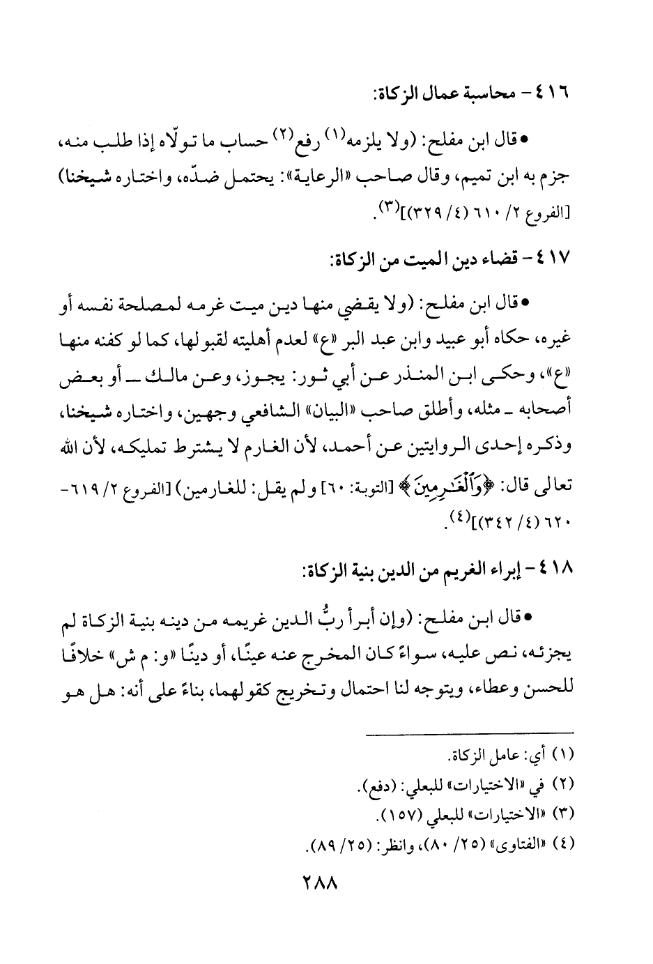* قال ابن مفلح: (ولا يقضي منها دين ميت غرمه لمصلحة نفسه أو غيره، حكاه أبو عبيد وابن عبد البر "ع" لعدم أهليته لقبولها، كما لو كفنه منها "ع"، وحكى ابن المنذر عن أبي ثور: يجوز، وعن مالك -أو بعض أصحابه- مثله، وأطلق صاحب "البيان" الشافعي وجهين، واختاره شيخنا، وذكره إحدى الروايتين عن أحمد، لأن الغارم لا يشترط تمليكه، لأن الله تعالى قال: {وَالْغَارِمِينَ} [التوبة: 60] ولم يقل: للغارمين) [الفروع 2/ 619 - 620 (4/ 342)] (¬4).