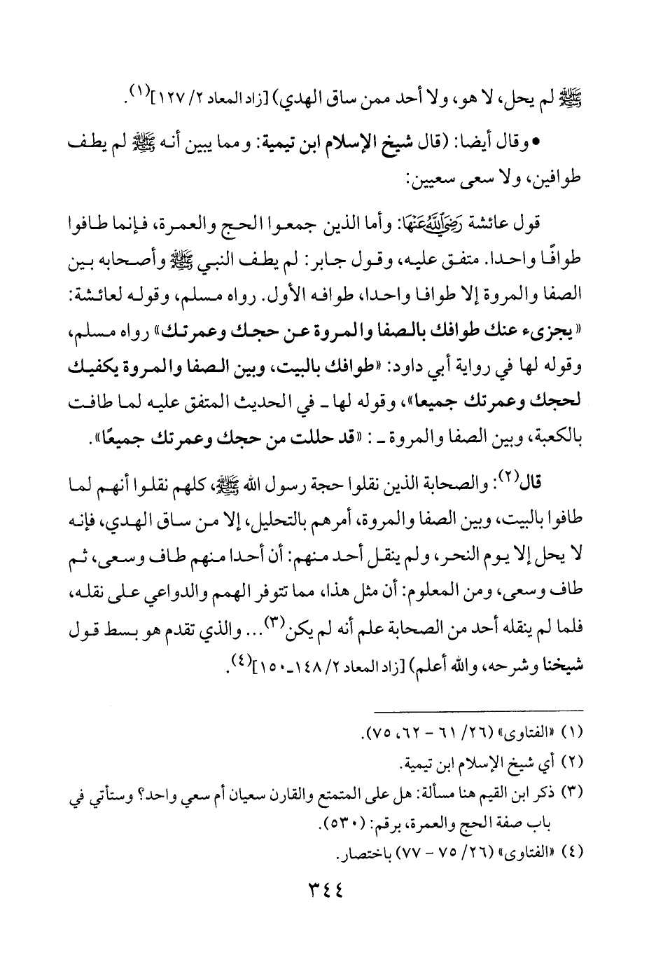 * وقال أيضًا: (قال شيخ الإسلام ابن تيمية: ومما يبين أنه - صلى الله عليه وسلم - لم يطف طوافين، ولا سعى سعيين: