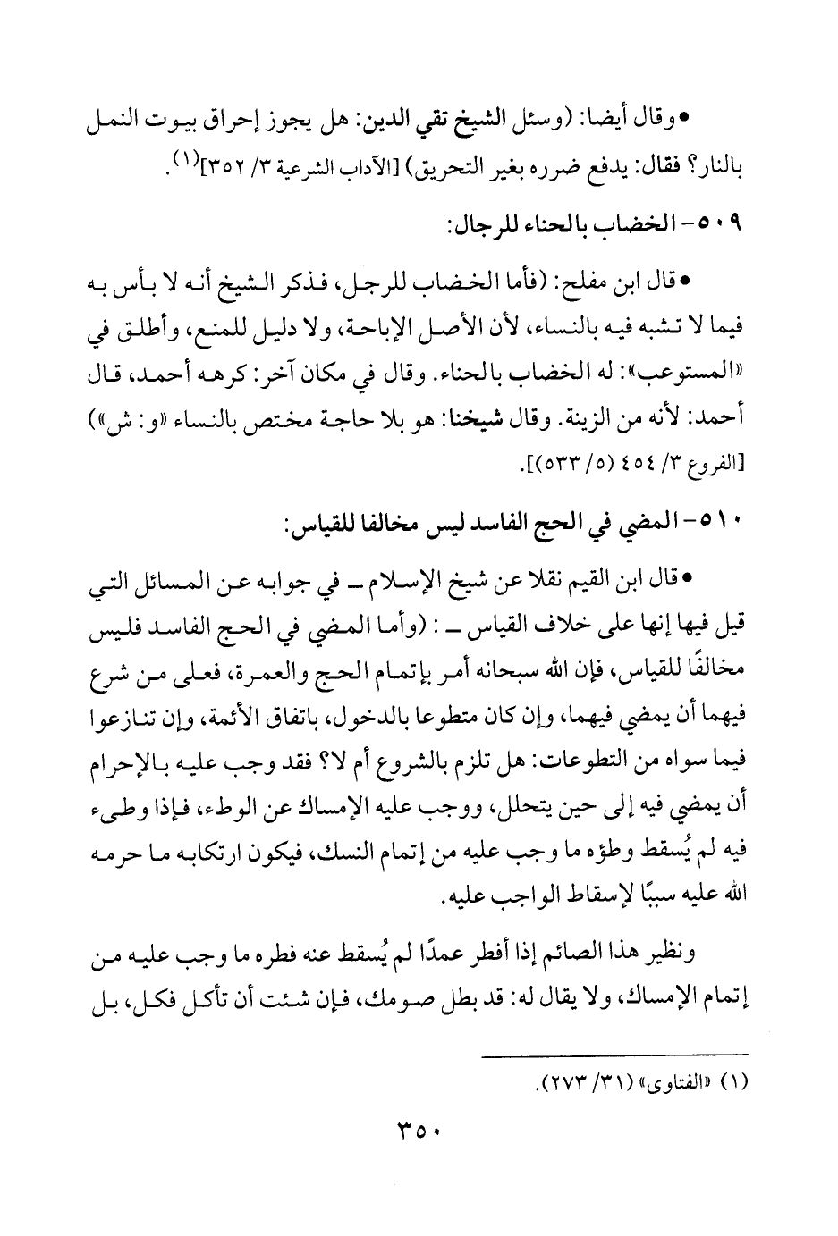 * وقال أيضًا: (وسئل الشيخ تقي الدين: هل يجوز إحراق بيوت النمل بالنار؟ فقال: يدفع ضرره بغير التحريق) [الآداب الشرعية 3/ 352] (¬1).