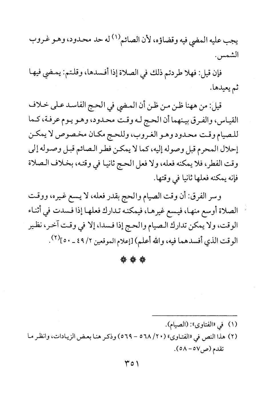 وسر الفرق: أن وقت الصيام والحج بقدر فعله، لا يسع غيره، ووقت الصلاة أوسع منها، فيسع غيرها، فيمكنه تدارك فعلها إذا فسدت في أثناء الوقت، ولا يمكن تدارك الصيام والحج إذا فسدا، إلا في وقت آخر، نظير الوقت الذي أفسد هما فيه، والله أعلم) [إعلام الموقعين 2/ 49 - 50] (¬2).