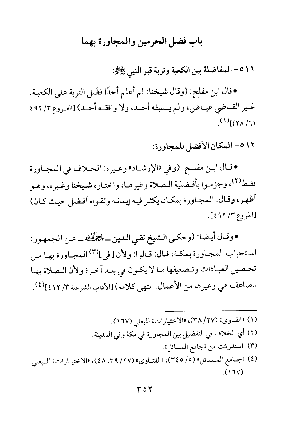 • قال ابن مفلح: (وقال شيخنا: لم أعلم أحدًا فضّل التربة على الكعبة، غير القاضي عياض، ولم يسبقه أحد، ولا وافقه أحد) [الفروع 3/ 492 (6/ 28)] (¬1).