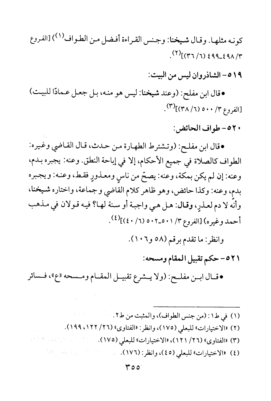 • قال ابن مفلح: (وتشترط الطهارة من حدث، قال القاضي وغيره: الطواف كالصلاة في جميع الأحكام، إلا في إباحة النطق. وعنه: يجبره بدم، وعنه: إن لم يكن بمكة، وعنه: يصحّ من ناسٍ ومعذورٍ فقط، وعنه: ويجبره بدمٍ، وعنه: وكذا حائض، وهو ظاهر كلام القاضي وجماعة، واختاره شيخنا، وأنه لا دم لعذرٍ، وقال: هل هي واجبة أو سنة لها؟ فيه قولان في مذهب أحمد وغيره) [الفروع 3/ 501 - 502 (6/ 40)] (¬4).