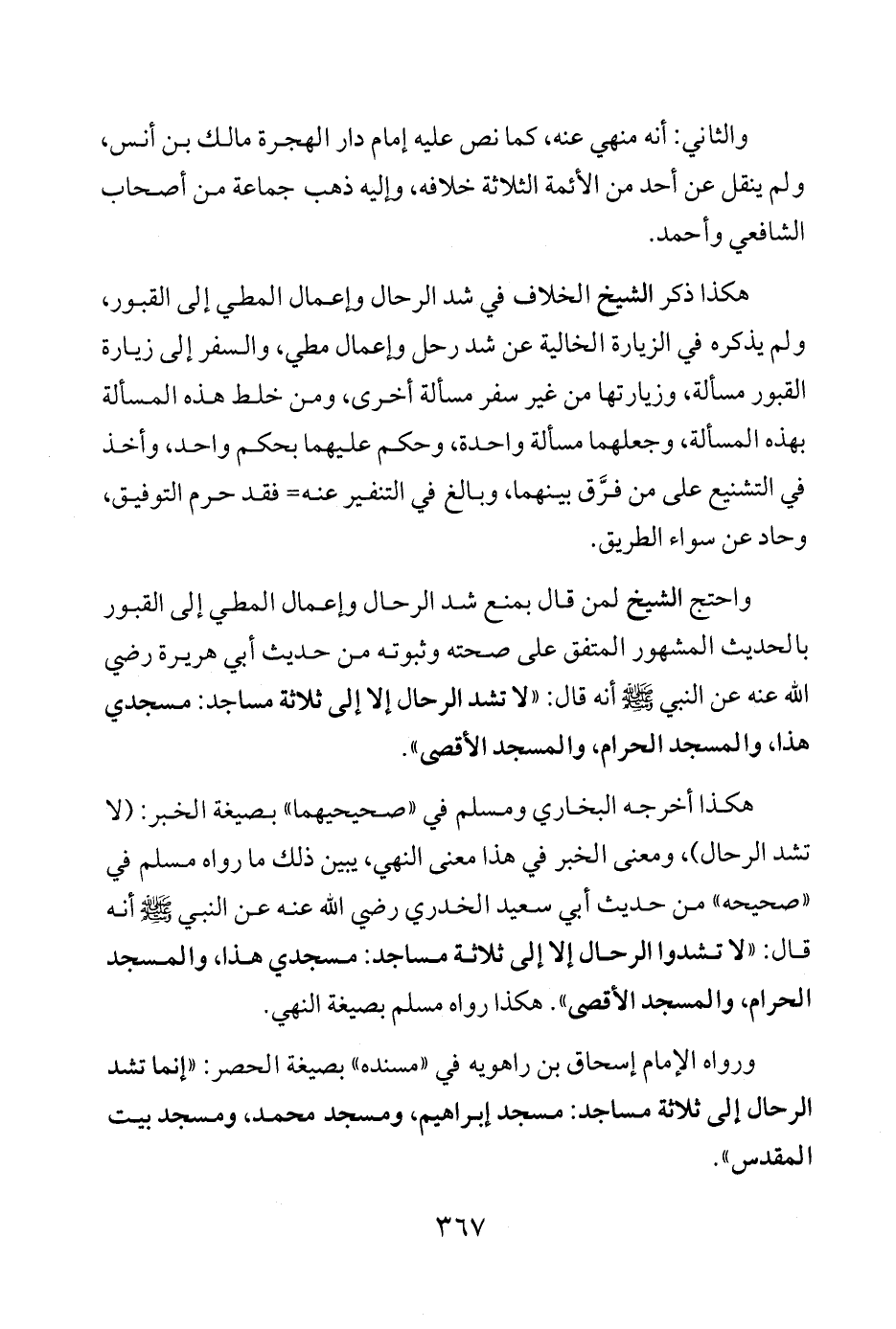 واحتج الشيخ لمن قال بمنع شد الرحال وإعمال المطي إلى القبور بالحديث المشهور المتفق على صحته وثبوته من حديث أبي هريرة رضي الله عنه عن النبي - صلى الله عليه وسلم - أنه قال: "لا تشد الرحال إلا إلى ثلاثة مساجد: مسجدي هذا، والمسجد الحرام، والمسجد الأقصى".