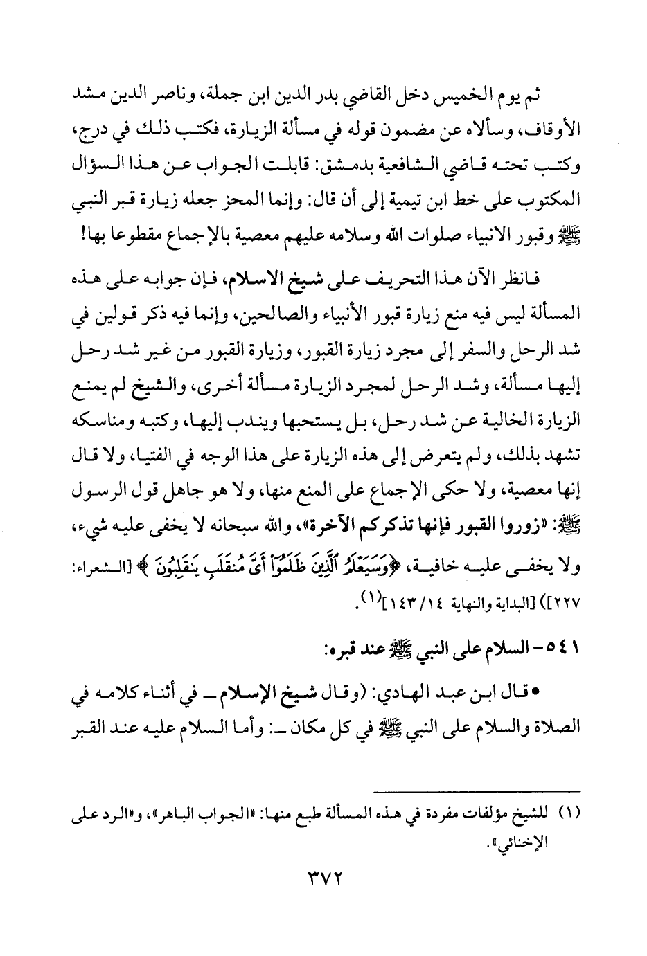 فانظر الآن هذا التحريف على شيخ الإسلام، فإن جوابه على هذه المسألة ليس فيه منع زيارة قبور الأنبياء والصالحين، وإنما فيه ذكر قولين في شد الرحل والسفر إلى مجرد زيارة القبور، وزيارة القبور من غير شد رحل إليها مسألة، وشد الرحل لمجرد الزيارة مسألة أخرى، والشيخ لم يمنع الزيارة الخالية عن شد رحل، بل يستحبها ويندب إليها، وكتبه ومناسكه تشهد بذلك، ولم يتعرض إلى هذه الزيارة على هذا الوجه في الفتيا، ولا قال إنها معصية، ولا حكى الإجماع على المنع منها، ولا هو جاهل قول الرسول - صلى الله عليه وسلم -: "زوروا القبور فإنها تذكركم الآخرة"، والله سبحانه لا يخفى عليه شيء، ولا يخفى عليه خافية، {وَسَيَعْلَمُ الَّذِينَ ظَلَمُوا أَيَّ مُنْقَلَبٍ يَنْقَلِبُونَ} [الشعراء: 227] [البداية والنهاية 14/ 143] (¬1).
