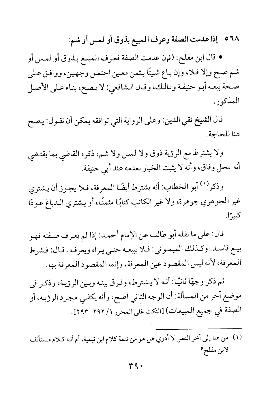 • قال ابن مفلح: (فإن عدمت الصفة فعرف المبيع بذوق أو لمس أو شم صح وإلا فلا، وإن باع شيئًا بثمن معين احتمل وجهين، ووافق على صحة بيعه أبو حنيفة ومالك، وقال الشافعي: لا يصح، بناء على الأصل المذكور.