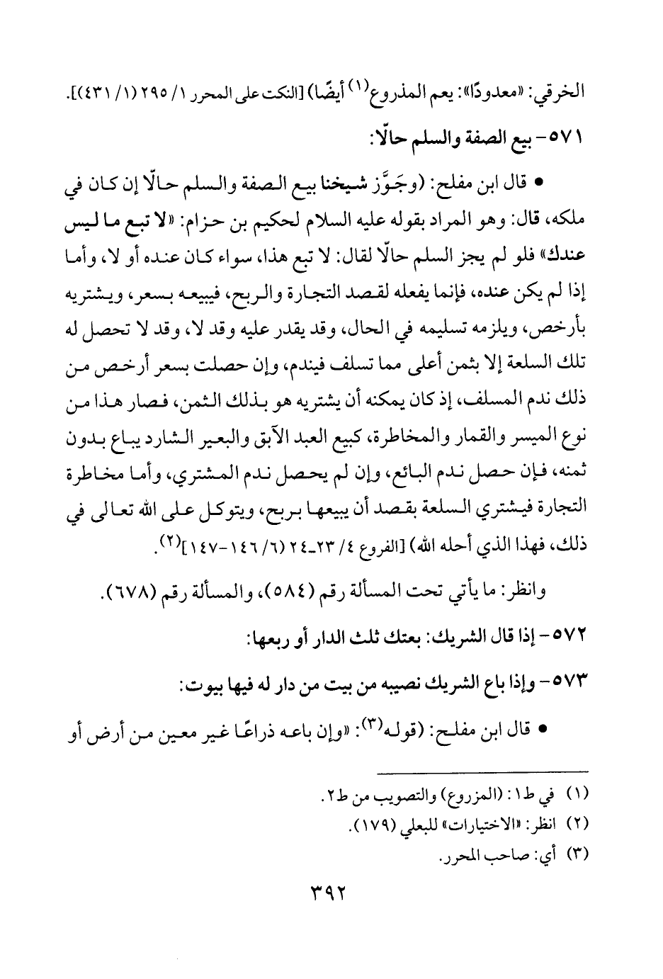 • قال ابن مفلح: (وجَوَّز شيخنا بيع الصفة والسلم حالّا إن كان في ملكه، قال: وهو المراد بقوله - عليه السلام - لحكيم بن حزام: "لا تبع ما ليس عندك" فلو لم يجز السلم حالّا لقال: لا تبع هذا، سواء كان عنده أو لا، وأما إذا لم يكن عنده، فإنما يفعله لقصد التجارة والربح، فيبيعه بسعر، ويشتريه بأرخص، ويلزمه تسليمه في الحال، وقد يقدر عليه وقد لا، وقد لا تحصل له تلك السلعة إلا بثمن أعلى مما تسلف فيندم، وإن حصلت بسعر أرخص من ذلك ندم المسلف، إذ كان يمكنه أن يشتريه هو بذلك الثمن، فصار هذا من نوع الميسر والقمار والمخاطرة، كبيع العبد الآبق والبعير الشارد يباع بدون ثمنه، فإن حصل ندم البائع، وإن لم يحصل ندم المشتري، وأما مخاطرة التجارة فيشتري السلعة بقصد أن يبيعها بربح، ويتوكل على الله تعالى في ذلك، فهذا الذي أحله الله) [الفروع 4/ 23 - 24 (6/ 146 - 147] (¬2).