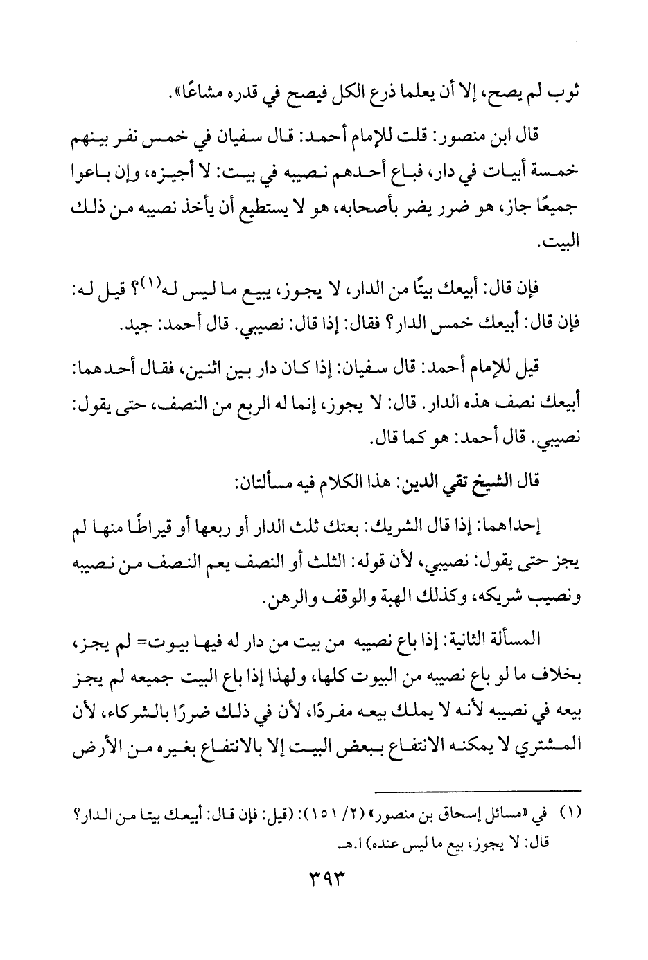 قيل للإمام أحمد: قال سفيان: إذا كان دار بين اثنين، فقال أحدهما: أبيعك نصف هذه الدار. قال: لا يجوز، إنما له الربع من النصف، حتى يقول: نصيبي. قال أحمد: هو كما قال.