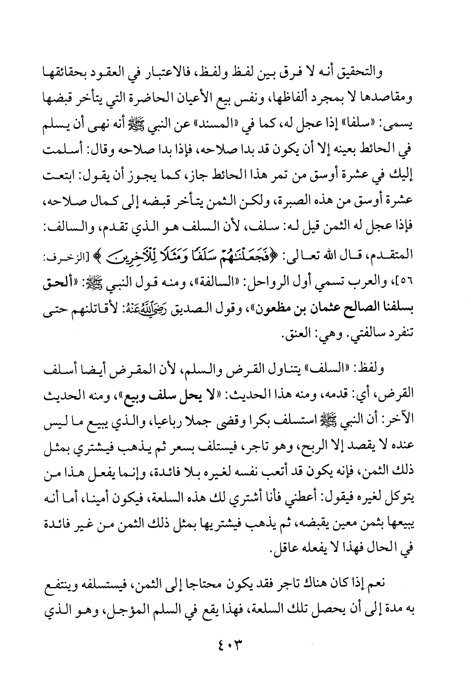 والتحقيق أنه لا فرق بين لفظ ولفظ، فالاعتبار في العقود بحقائقها ومقاصدها لا بمجرد ألفاظها، ونفس بيع الأعيان الحاضرة التي يتأخر قبضها يسمى: "سلفا" إذا عجل له، كما في "المسند" عن النبي - صلى الله عليه وسلم - أنه نهى أن يسلم في الحائط بعينه إلا أن يكون قد بدا صلاحه، فإذا بدا صلاحه وقال: أسلمت إليك في عشرة أوسق من تمر هذا الحائط جاز، كما يجوز أن يقول: ابتعت عشرة أوسق من هذه الصبرة، ولكن الثمن يتأخر قبضه إلى كمال صلاحه، فإذا عجل له الثمن قيل له: سلف، لأن السلف هو الذي تقدم، والسالف: المتقدم، قال الله تعالى: {فَجَعَلْنَاهُمْ سَلَفًا وَمَثَلًا لِلْآخِرِينَ} [الزخرف: 56]، والعرب تسمي أول الرواحل: "السالفة"، ومنه قول النبي - صلى الله عليه وسلم -: "ألحق بسلفنا الصالح عثمان بن مظعون"، وقول الصديق - رضي الله عنه -: لأقاتلنهم حتى تنفرد سالفتي. وهي: العنق.