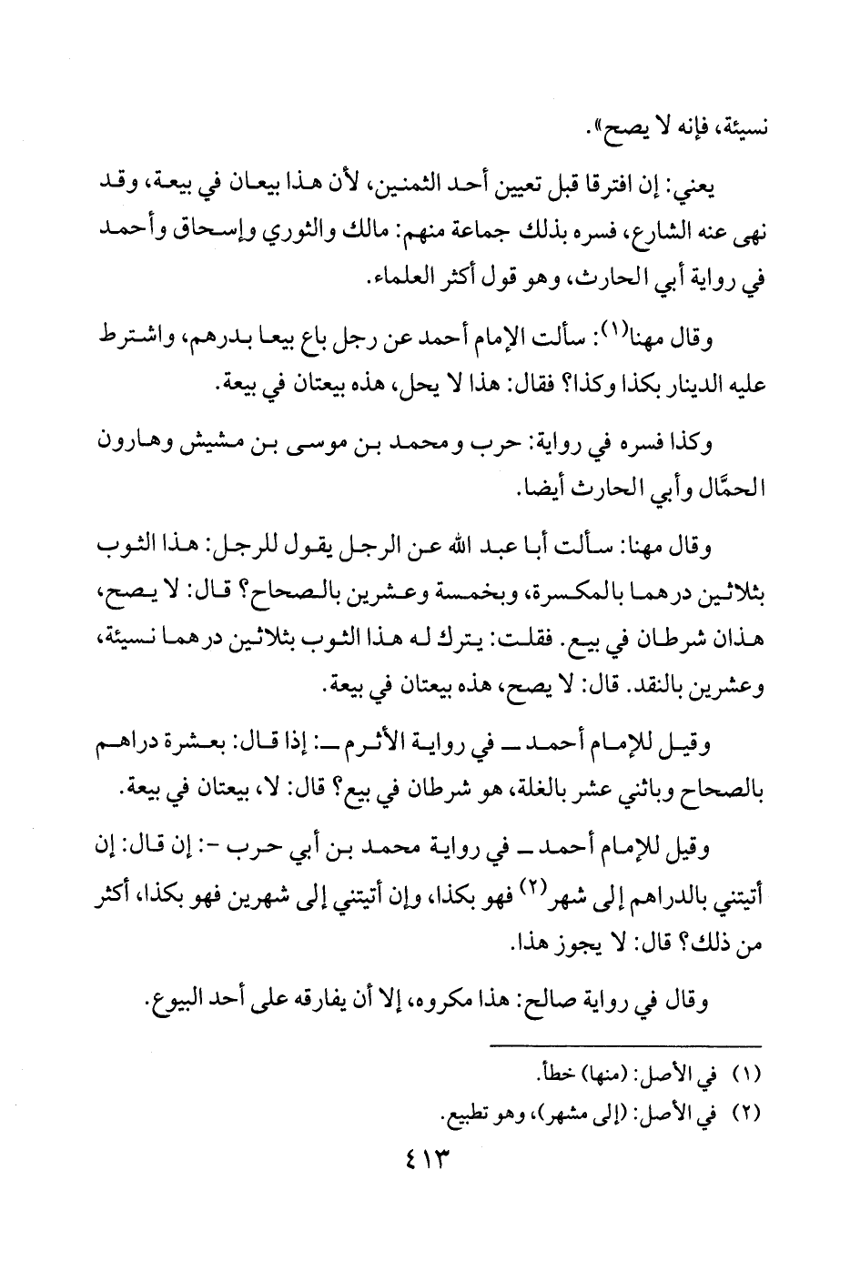 وقال مهنا: سألت أبا عبد الله عن الرجل يقول للرجل: هذا الثوب بثلاثين درهما بالمكسرة، وبخمسة وعشرين بالصحاح؟ قال: لا يصح، هذان شرطان في بيع. فقلت: يترك له هذا الثوب بثلاثين درهما نسيئة، وعشرين بالنقد. قال: لا يصح، هذه بيعتان في بيعة.